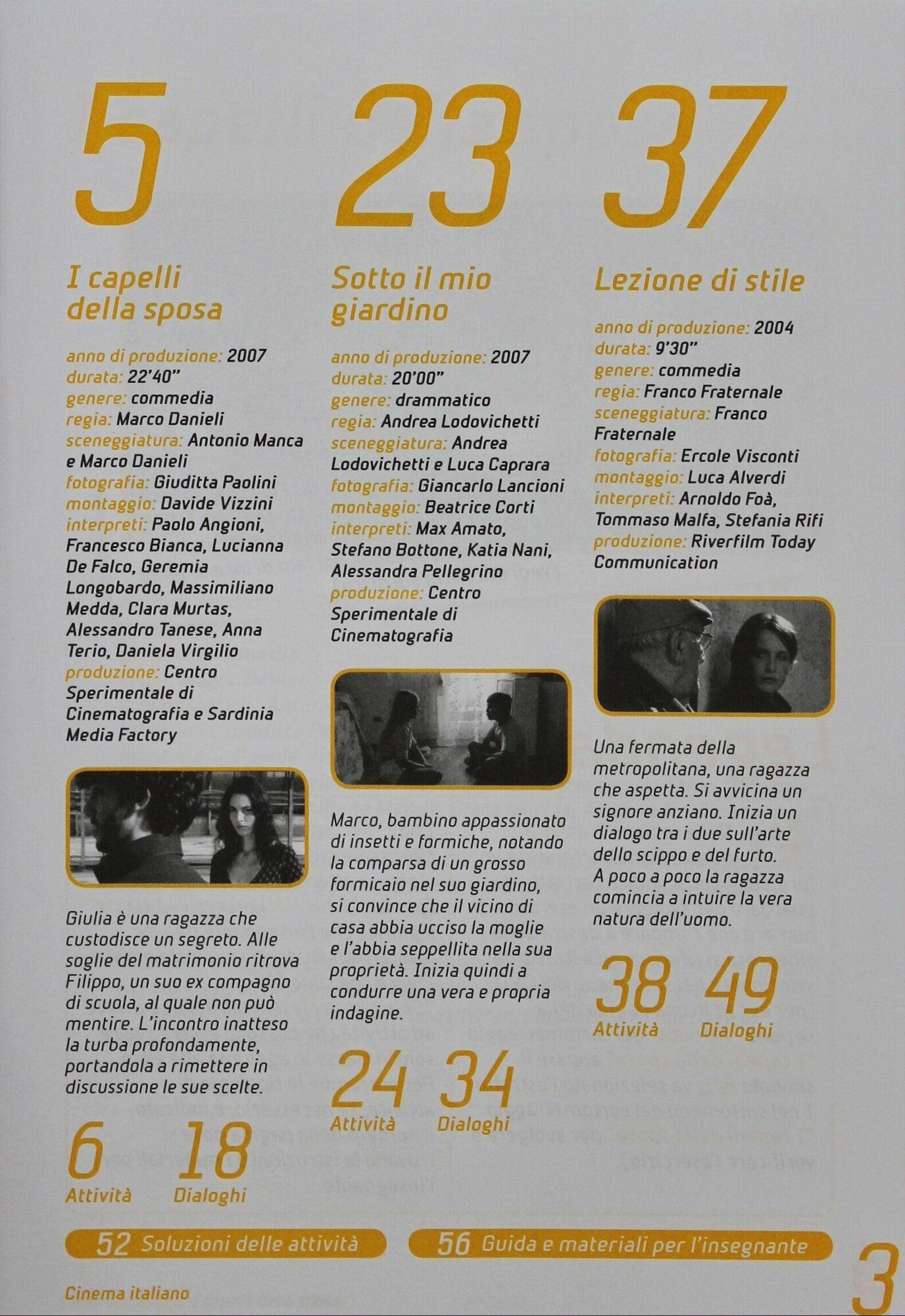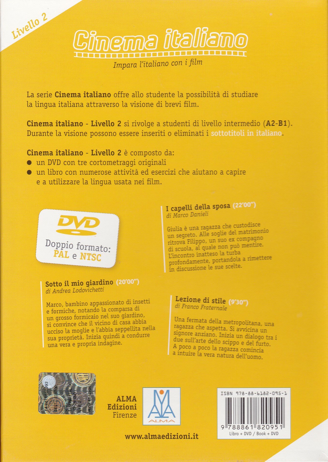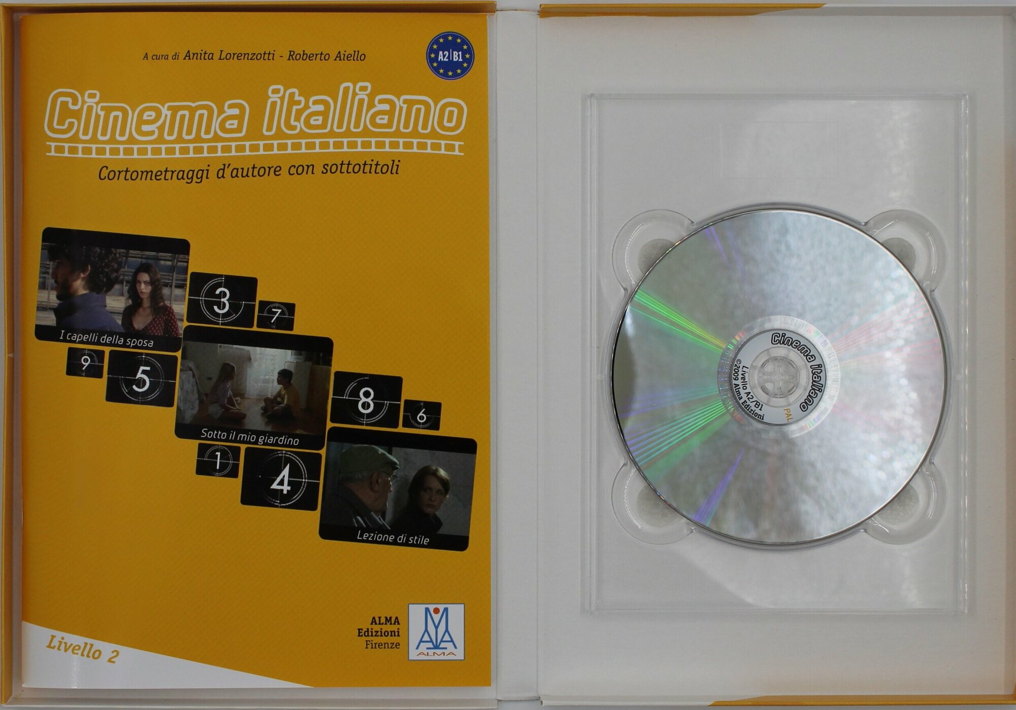 Остальные три комплекта соответствует определенному уровню владения языком: начальный (A1-A2), средний (A2-B1) и продвинутый (B1-C1). Каждый комплект включает в себя: DVD-диск с тремя авторскими короткометражками продолжительностью от 10 до 25 минут + книгу с многочисленными заданиями и упражнениями, которые помогут лучше понять и научиться использовать язык фильма. Фильмы можно смотреть как с итальянскими субтитрами, так и без них.