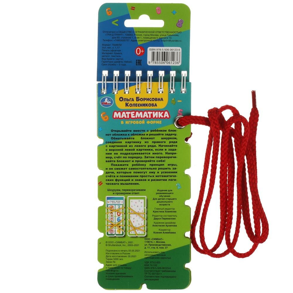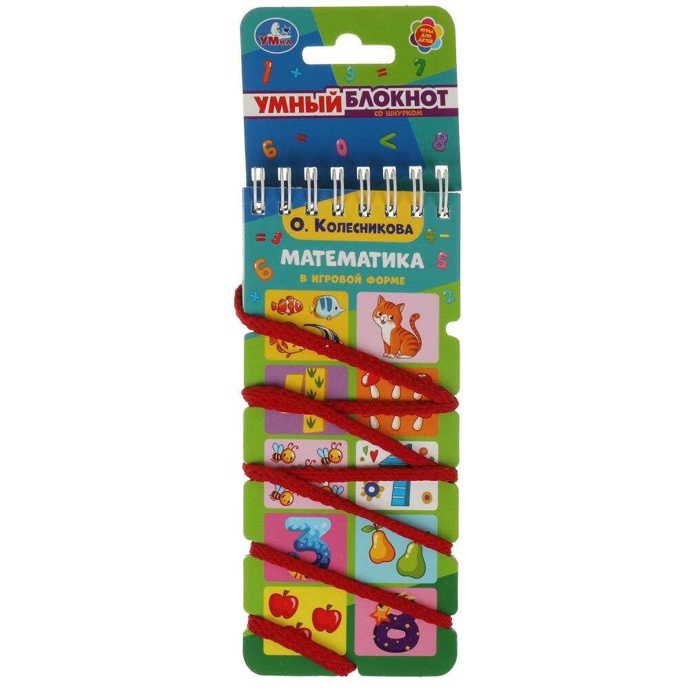 Умный блокнот со шнурком «О. Колесникова. Математика в игровой форме» ТМ «УМка» непременно понравится маленьким любознайкам:- учим буквы- интересный формат: шнуруем, переворачиваем и проверяем ответ- увлекательно и познавательно- занимательные заданияСуть занятия: блокнот открывается обложка к обложке, ребёнок вместе с родителями решает задачу, соединяя с помощью шнурка картинку из правого ряда с картинкой из левого ряда. Ответ можно проверить, перевернув блокнот: если узор шнурка совпадает с нарисованным узором на страничке, значит задача решена верно. Такие увлекательные игровые задания помогут дошкольнику в усвоении счёта и понимании простых математических функций и знаков и развитии логического мышления.Занятия с блокнотом ТМ «УМка» также способствуют развитию:- мелкой моторики рук- памяти- внимания- усидчивостиОбъём: 32 стр. Формат: 70 х 155 мм.Материал: офсетная бумага + картон + металл + текстиль.Рекомендовано детям старшего дошкольного возраста.