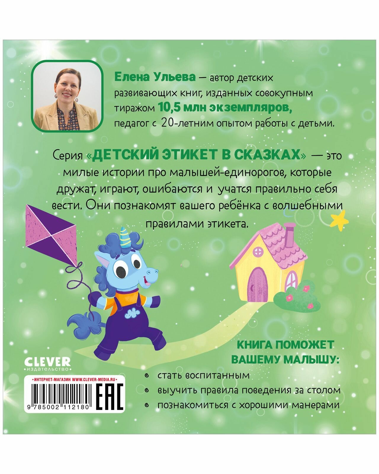 Елена Ульева - автор детских развивающих книг, изданных совокупным тиражом 10,5 млн экземпляров, педагог с 20-летним опытом работы с детьми. Серия "Детский этикет в сказках" - это милые истории про малышей-единорогов, которые дружат, играют, ошибаются и учатся правильно себя вести. Они познакомят вашего ребёнка с волшебными правилами этикета. Книга поможет вашему малышу: - стать воспитанным; - выучить правила поведения за столом; - познакомиться с хорошими манерами.
