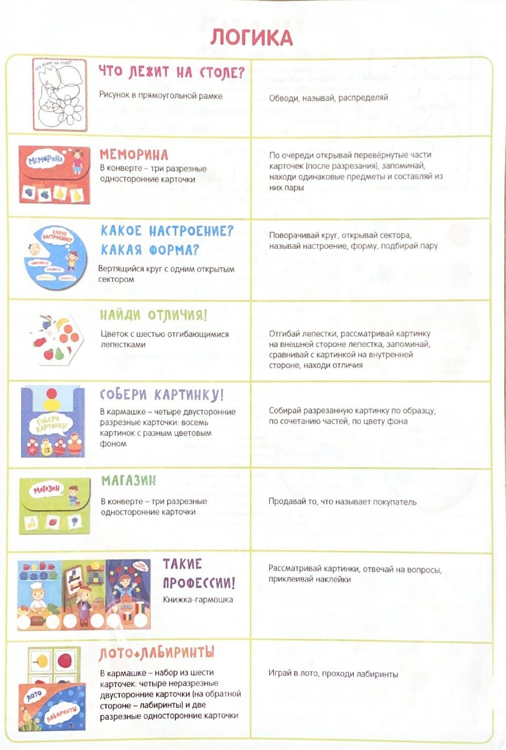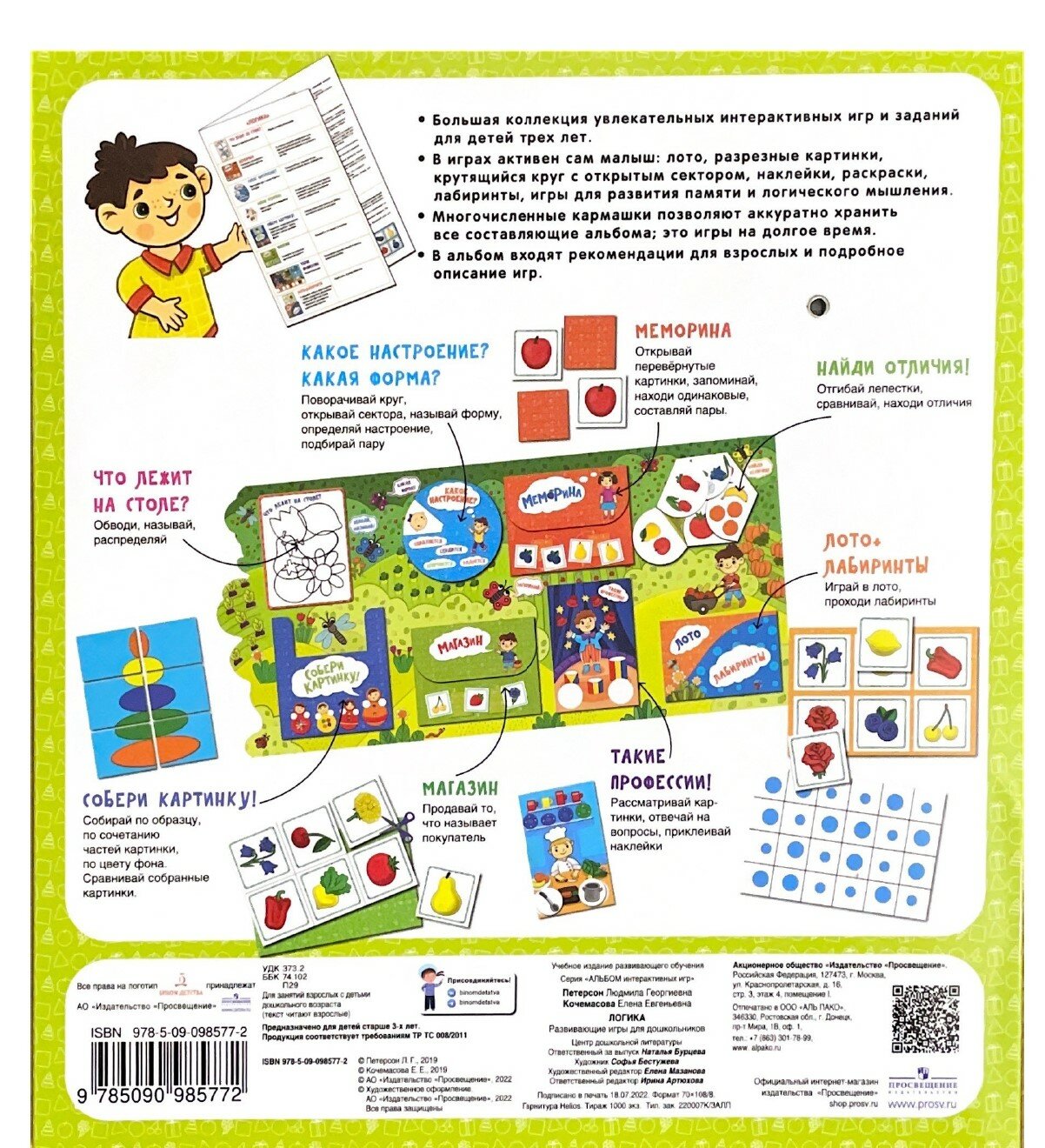 "Логика" - это большая тематическая интерактивная папка с кармашками, окошками, мини-книжкой, подвижными деталями, вставками, которые ребенок может доставать, перекладывать и складывать, выполняя задания. Так малыш в игровой форме запоминает и закрепляет тематический материал. Большая коллекция увлекательных интерактивных игр и заданий для детей трех лет. В играх активен сам малыш: лото, разрезные картинки, крутящийся кург с открытым сектором, наклейки, раскраски, лабиринты, игры для развития памяти и логического мышления. Многочисленные кармашки позволяют аккуратно хранить все составляющие альбома; это игры на долгое время. В альбом входят рекомендации для взрослых и подробное описание игр.