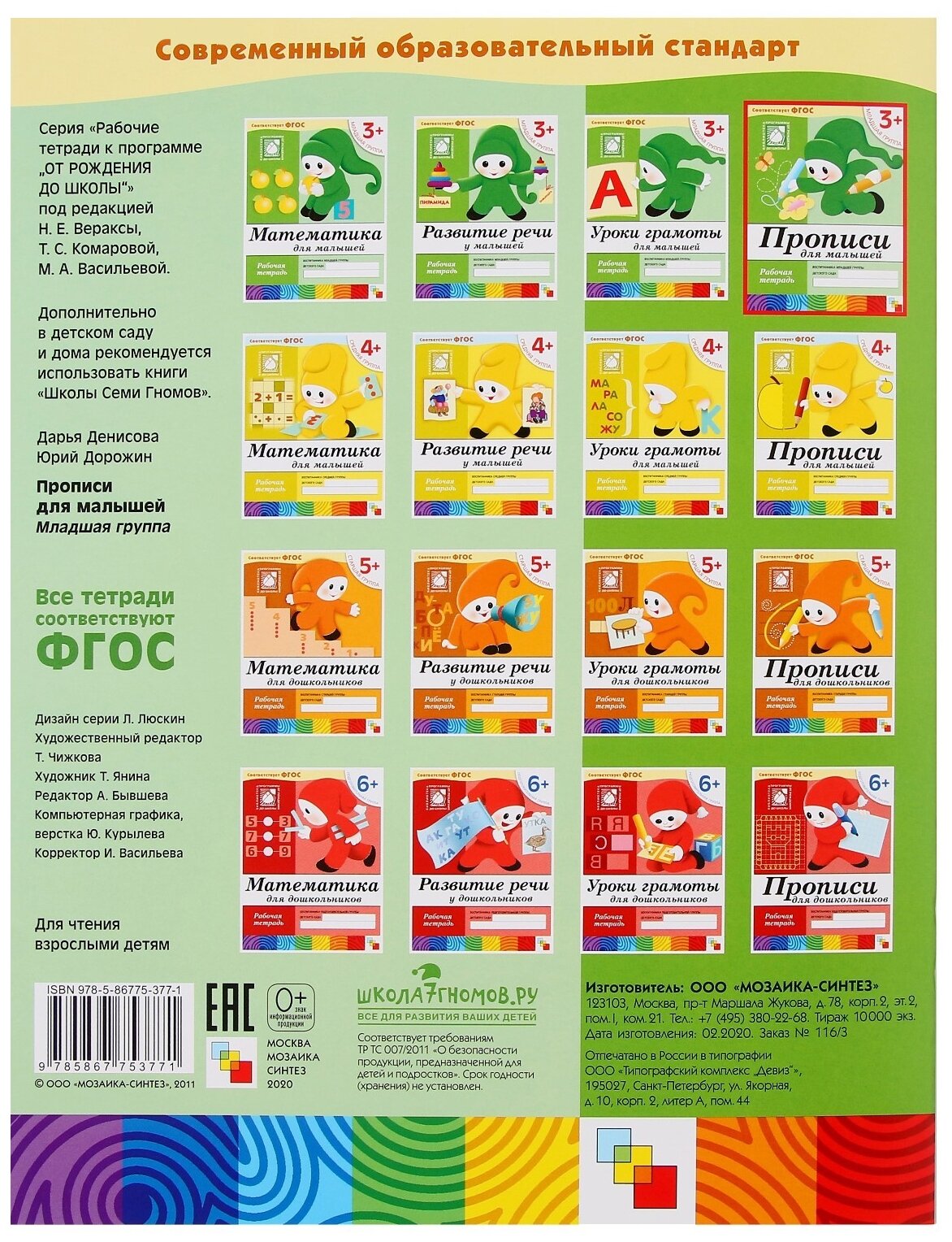 Программа " От рождения до школы" под редакцией Н. Е. Вераксы, Т. С. Комаровой, М. А. Васильевой разработана на основе ФГОС до и предназначена для использования в дошкольных образовательных организациях для формирования основных образовательных программ дошкольных организаций, опирается на лучшие традиции отечественного образования. Издание можно использовать как дополнение к обучающему комплексу «Школа семи гномов». Предназначено для занятий с детьми дома и в младшей группе детского сада.