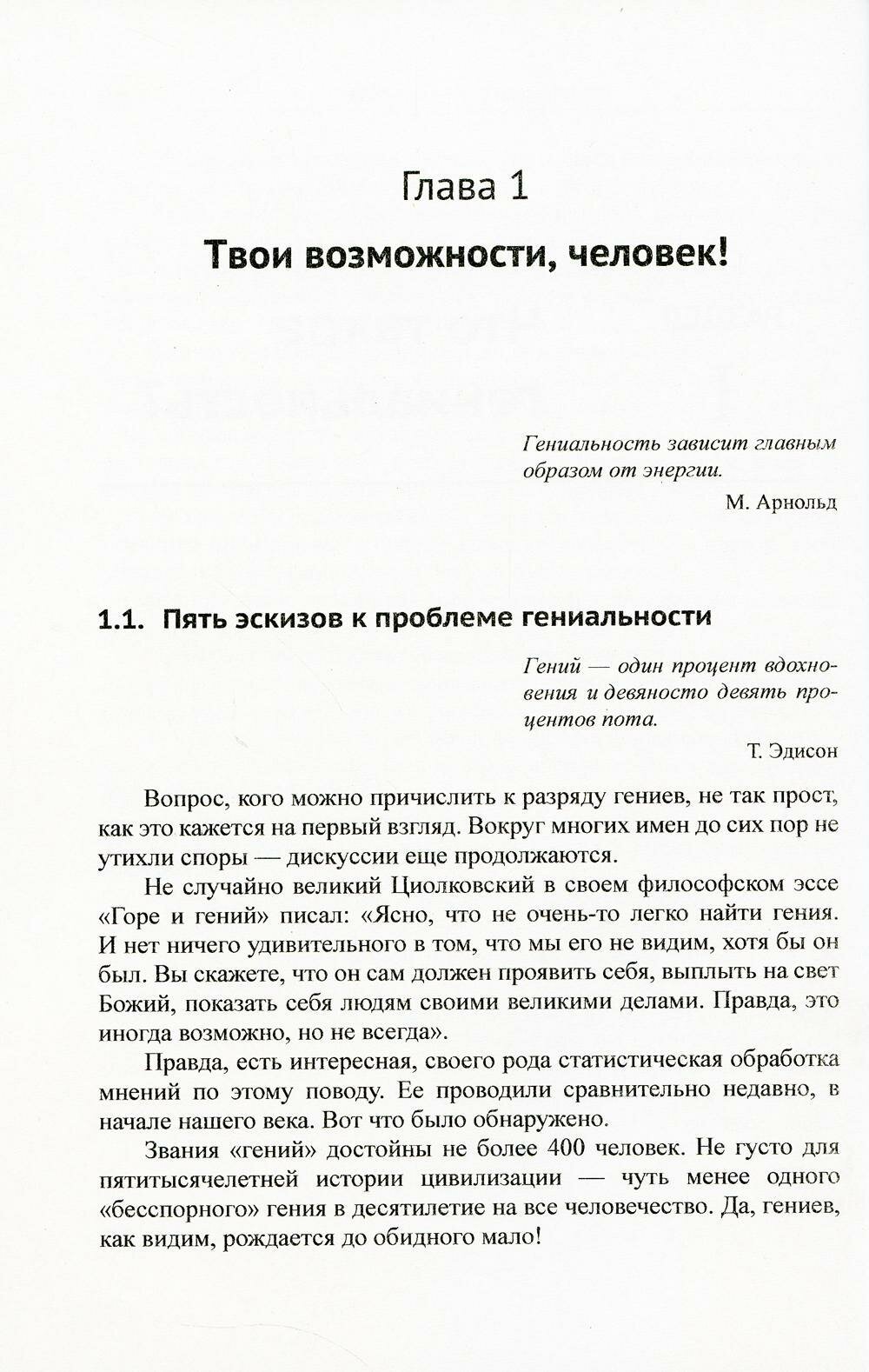 В книге рассказывается об интеллектуальных, психических и физических резервах, которыми обладает каждый человек, о некоторых научно обоснованных приемах и средствах развития наблюдательности, памяти, внимания, творческих способностях в целом. Затрагиваются также актуальные вопросы организации творческой работы в условиях информационных перегрузок, взаимоотношений личности и коллектива, управления коллективом и его совершенствования, развития личности в условиях современной жизни. Книга предназначена самому широкому кругу читателей, будет интересна и специалистам, работающим в различных областях науки - от биологов и медиков до психологов, педагогов и философов.