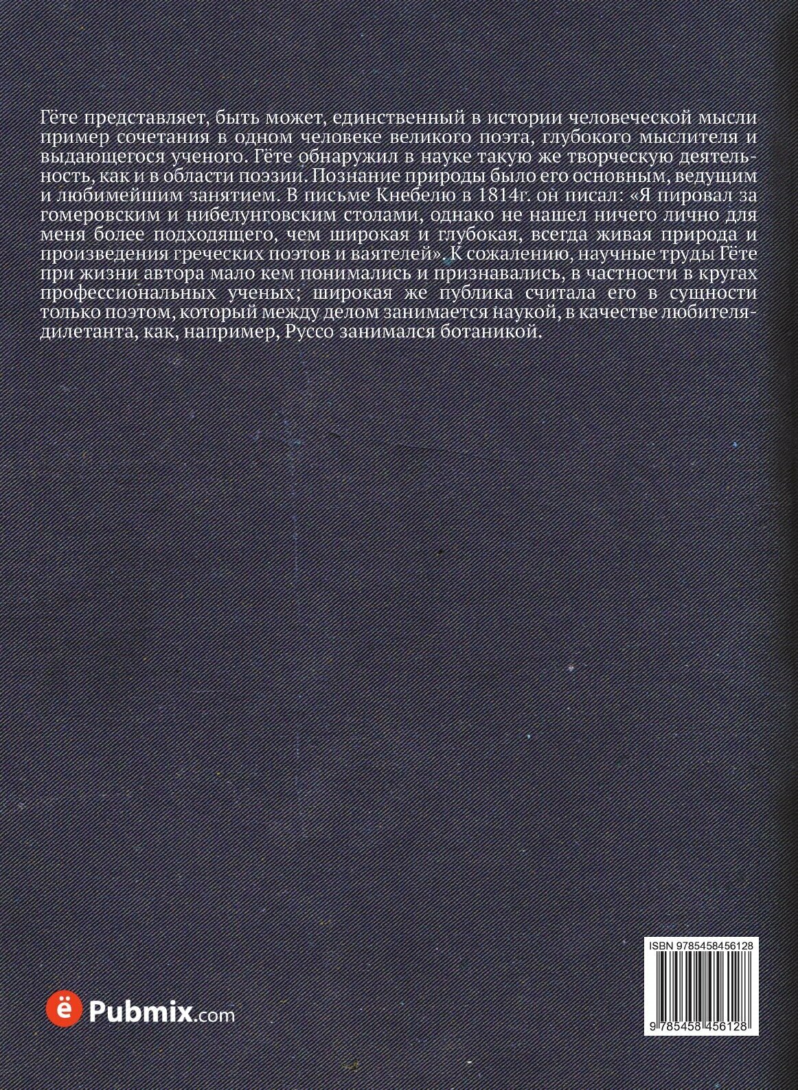 Эта книга — репринт оригинального издания (издательство "Издательство Академии наук СССР", 1957 год), созданный на основе электронной копии высокого разрешения, которую очистили и обработали вручную, сохранив структуру и орфографию оригинального издания. Редкие, забытые и малоизвестные книги, изданные с петровских времен до наших дней, вновь доступны в виде печатных книг._x000D_ _x000D_ Гёте представляет, быть может, единственный в истории человеческой мысли пример сочетания в одном человеке великого поэта, глубокого мыслителя и выдающегося ученого. Гёте обнаружил в науке такую же творческую деятельность, как и в области поэзии. Познание природы было его основным, ведущим и любимейшим занятием. В письме Кнебелю в 1814г. он писал: «Я пировал за гомеровским и нибелунговским столами, однако не нашел ничего лично для меня более подходящего, чем широкая и глубокая, всегда живая природа и произведения греческих поэтов и ваятелей». К сожалению, научные труды Гёте при жизни автора мало кем понимались и признавались, в частности в кругах профессиональных ученых; широкая же публика считала его в сущности только поэтом, который между делом занимается наукой, в качестве любителя-дилетанта, как, например, Руссо занимался ботаникой.