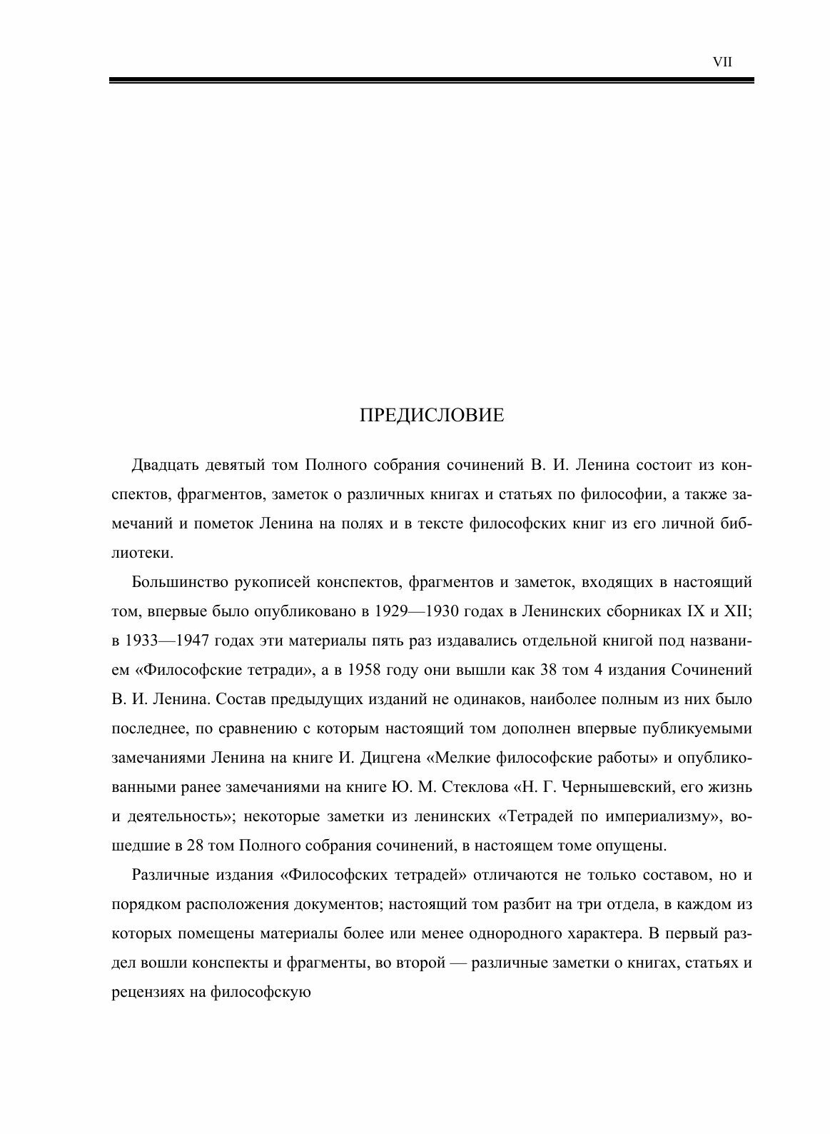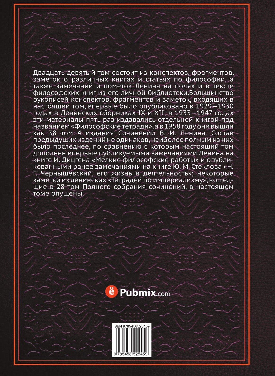 Эта книга — репринт оригинального издания (издательство "Издательство политической литературы", 1969 год), созданный на основе электронной копии высокого разрешения, которую очистили и обработали вручную, сохранив структуру и орфографию оригинального издания. Редкие, забытые и малоизвестные книги, изданные с петровских времен до наших дней, вновь доступны в виде печатных книг._x000D_ _x000D_ Двадцать девятый том состоит из конспектов, фрагментов, заметок о различных книгах и статьях по философии, а также замечаний и пометок Ленина на полях и в тексте философских книг из его личной библиотеки.Большинство рукописей конспектов, фрагментов и заметок, входящих в настоящий том, впервые было опубликовано в 1929—1930 годах в Ленинских сборниках IX и XII; в 1933—1947 годах эти материалы пять раз издавались отдельной книгой под названием «Философские тетради», а в 1958 году они вышли как 38 том 4 издания Сочинений В. И. Ленина. Состав предыдущих изданий не одинаков, наиболее полным из них было последнее, по сравнению с которым настоящий том дополнен впервые публикуемыми замечаниями Ленина на книге И. Дицгена «Мелкие философские работы» и опубликованными ранее замечаниями на книге Ю. М. Стеклова «Н. Г. Чернышевский, его жизнь и деятельность»; некоторые заметки из ленинских «Тетрадей по империализму», вошедшие в 28 том Полного собрания сочинений, в настоящем томе опущены.