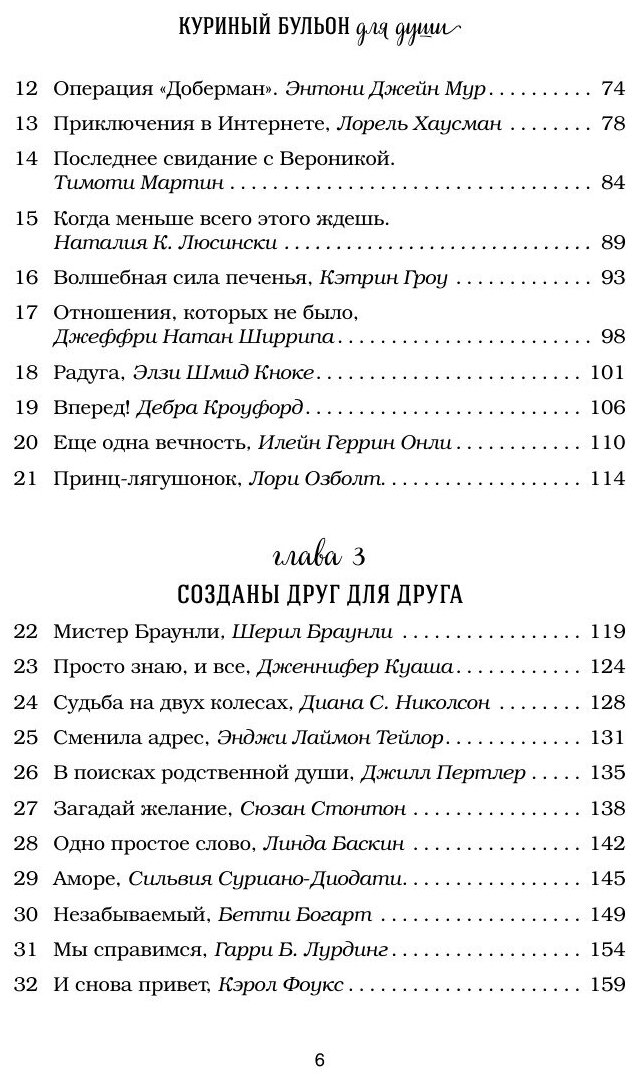 В детстве, когда вы болели, ваша бабушка давала вам куриный бульон. Сегодня питание и забота нужны вашей душе. Маленькие истории из «Куриного бульона» – исцелят душевные раны и укрепят дух, дадут вашим мечтам новые крылья и откроют секрет самого большого счастья – счастья делиться и любить. Что делать, если ты влюбился и ты…. монах. Чем заканчивается свидание, которое начинается с разбитой фары. Оригинальный способ встретить Принца – коллекционировать лягушат. Разведенная женщина 33 лет встречает первую любовь – школьного учителя. Как не отчаяться, когда все вокруг выходят замуж, а ты все ждешь. Чем больше детей, тем меньше романтики – или наоборот?! И другие 95 волнующих историй о любви, от которых вы не сможете оторваться.