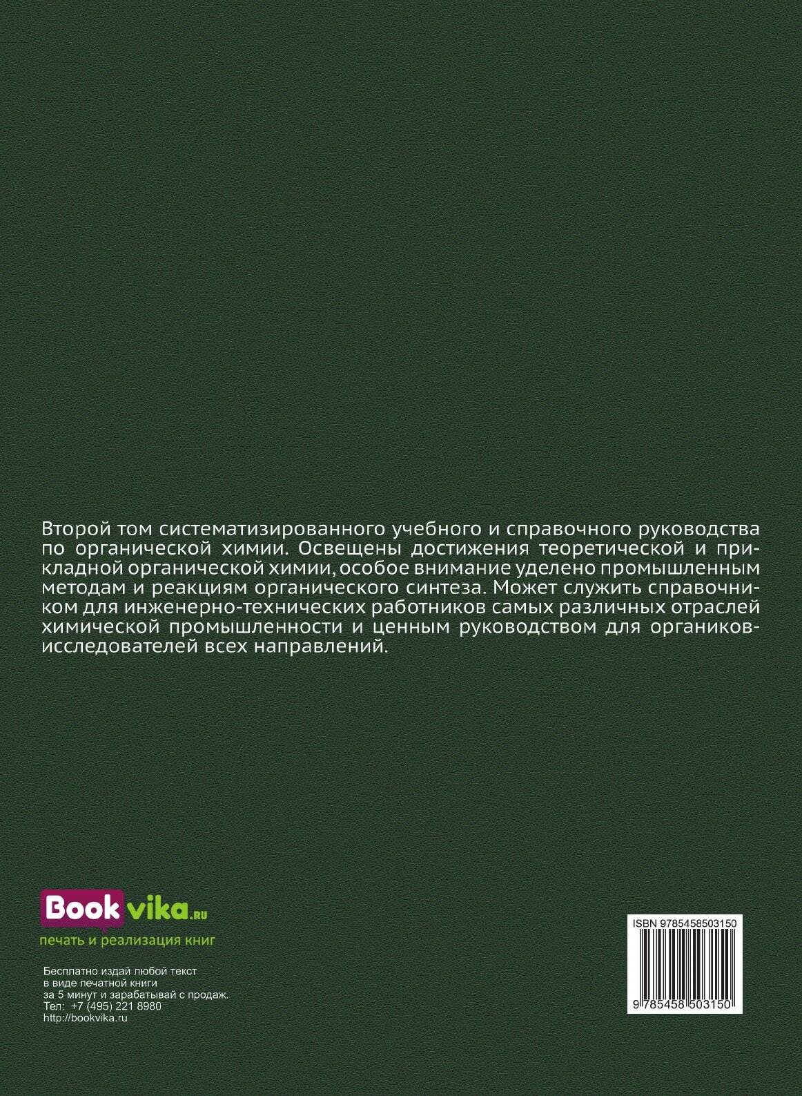 Эта книга — репринт оригинального издания (издательство "Химия", 1966 год), созданный на основе электронной копии высокого разрешения, которую очистили и обработали вручную, сохранив структуру и орфографию оригинального издания. Редкие, забытые и малоизвестные книги, изданные с петровских времен до наших дней, вновь доступны в виде печатных книг._x000D_ _x000D_ Второй том систематизированного учебного и справочного руководства по органической химии. Освещены достижения теоретической и прикладной органической химии, особое внимание уделено промышленным методам и реакциям органического синтеза. Может служить справочником для инженерно-технических работников самых различных отраслей химической промышленности и ценным руководством для органиков-исследователей всех направлений.