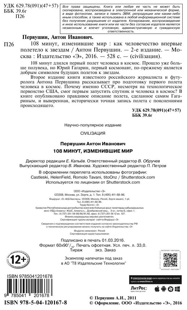 "108 минут длился первый полет человека в космос. Прошло уже больше полувека, но Юрий Гагарин, первый космонавт, по-прежнему является добрым символом будущих полетов к звездам.Второе издание книги известного российского журналиста и футуролога Антона Первушина рассказывает про подготовку первого полета человека в космос. Почему именно СССР, несмотря на технологическое первенство США, смог первым запустить спутник и человека в космос? В книге опубликовано правдивое описание полета, сделанное самим Гагариным, и выверенная, исторически точная запись полета с пояснениями происходящего."