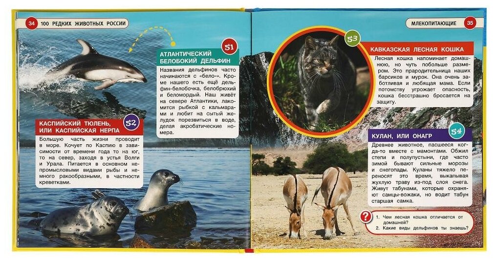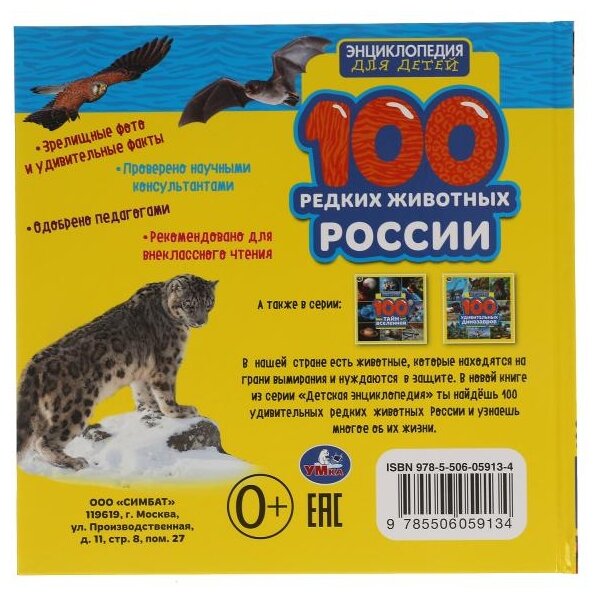 Энциклопедия для детей «100 редких животных России» ТМ «УМка» обязательно заинтересует маленького любознайку: - увлекательно и познавательно - красочные иллюстрации - проверено научными консультантами - одобрено педагогами - удобный для ребёнка формат книги. Данная энциклопедия в занимательной форме познакомит юного читателя с редкими видами животных, обитающих на территории нашей страны. А удивительные факты и зрелищные фотографии помогут ему быстро и эффективно усвоить новую информацию. Чтение энциклопедии ТМ «УМка» способствует расширению кругозора и развитию: - визуального восприятия -… внимания - памяти - усидчивости.