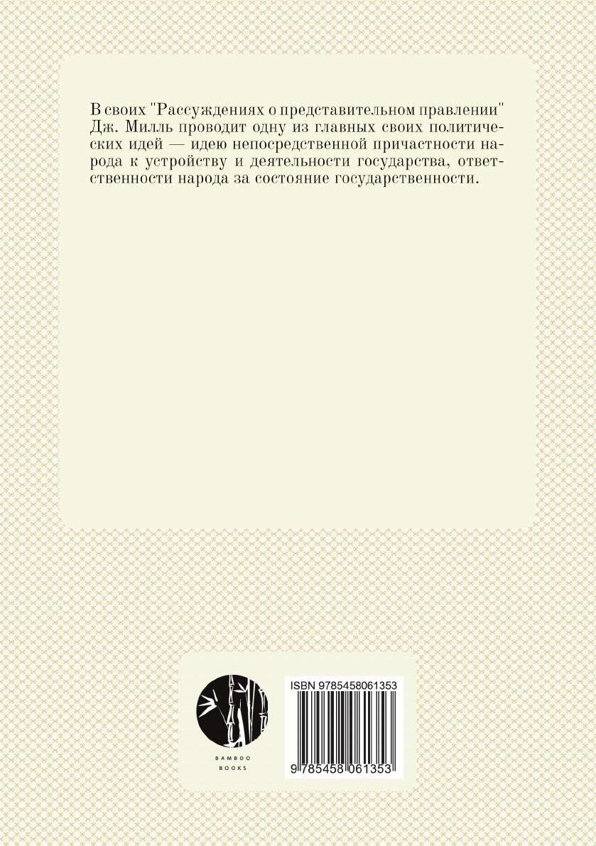 Эта книга — репринт оригинального издания (издательство "Санкт-Петербург, Яковлев", 1863 год), созданный на основе электронной копии высокого разрешения, которую очистили и обработали вручную, сохранив структуру и орфографию оригинального издания. Редкие, забытые и малоизвестные книги, изданные с петровских времен до наших дней, вновь доступны в виде печатных книг._x000D_ _x000D_ В своих "Рассуждениях о представительном правлении" Дж. Милль проводит одну из главных своих политических идей — идею непосредственной причастности народа к устройству и деятельности государства, ответственности народа за состояние государственности.