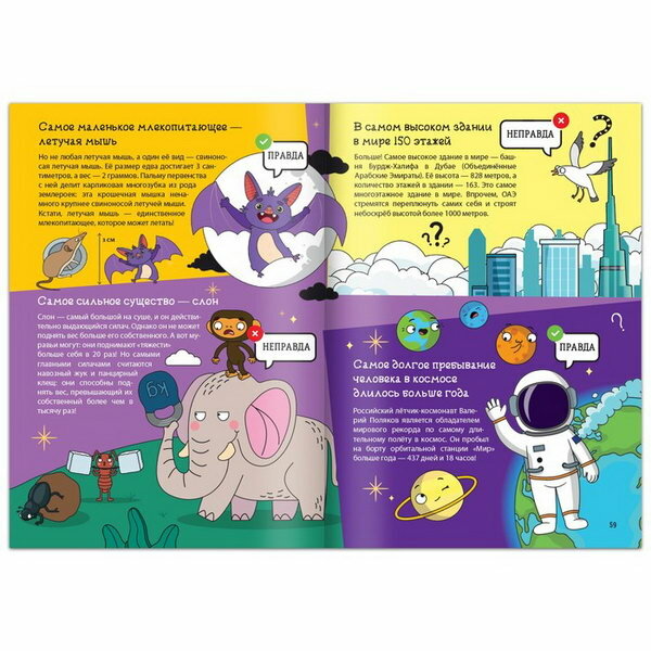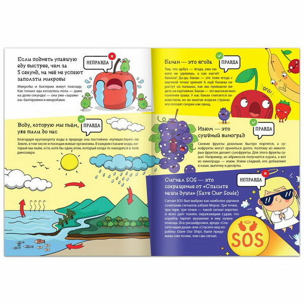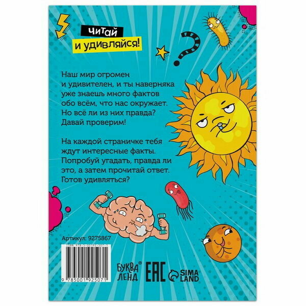 Книга «Это правда или нет?», 68 стр.Наш мир огромен и удивителен, и вы наверняка уже знаете много фактов обо всём, что нас окружает. Но все ли из них правда?Давайте проверим!На каждой страничке вас ждут интересные факты. Попробуйте угадать, правда ли это, а затем прочитайте ответ. Например:самое сильное существо — слон;если поднять упавшую еду быстрее, чем за 5 секунд, на неё не успеют заползти микробы.В книге вы найдёте факты разной тематики:«Земля и Солнечная система».«Мир животных».«Тело человека».«Что из чего».«Необычное об обычном».«Как давно это было».«Как в народе говорят».«Самые-самые».Читайте и удивляйтесь!Книга рекомендована для детей от 7 лет.-Вес: 188 г.-Количество в упаковке: 1-Кол-во страниц: 68-Тип индивидуальной упаковки: Без упаковки-Длина упаковки: 24-Высота упаковки: 0.5-Ширина упаковки: 17-Объем упаковки: 0.204-Объем продукта: 0.2768-Объем бокса: 13.838-Материал: Бумага-Набор: Нет-Возраст: От 7 лет, Для детей-Количество страниц: 68-Год издания: 2022-Тема обучения: Окружающий мир-Вид: Обучающие книги-Тип обложки: Мягкий переплёт-Температурное ограничение: Нет-Тема энциклопедии: Окружающий мир