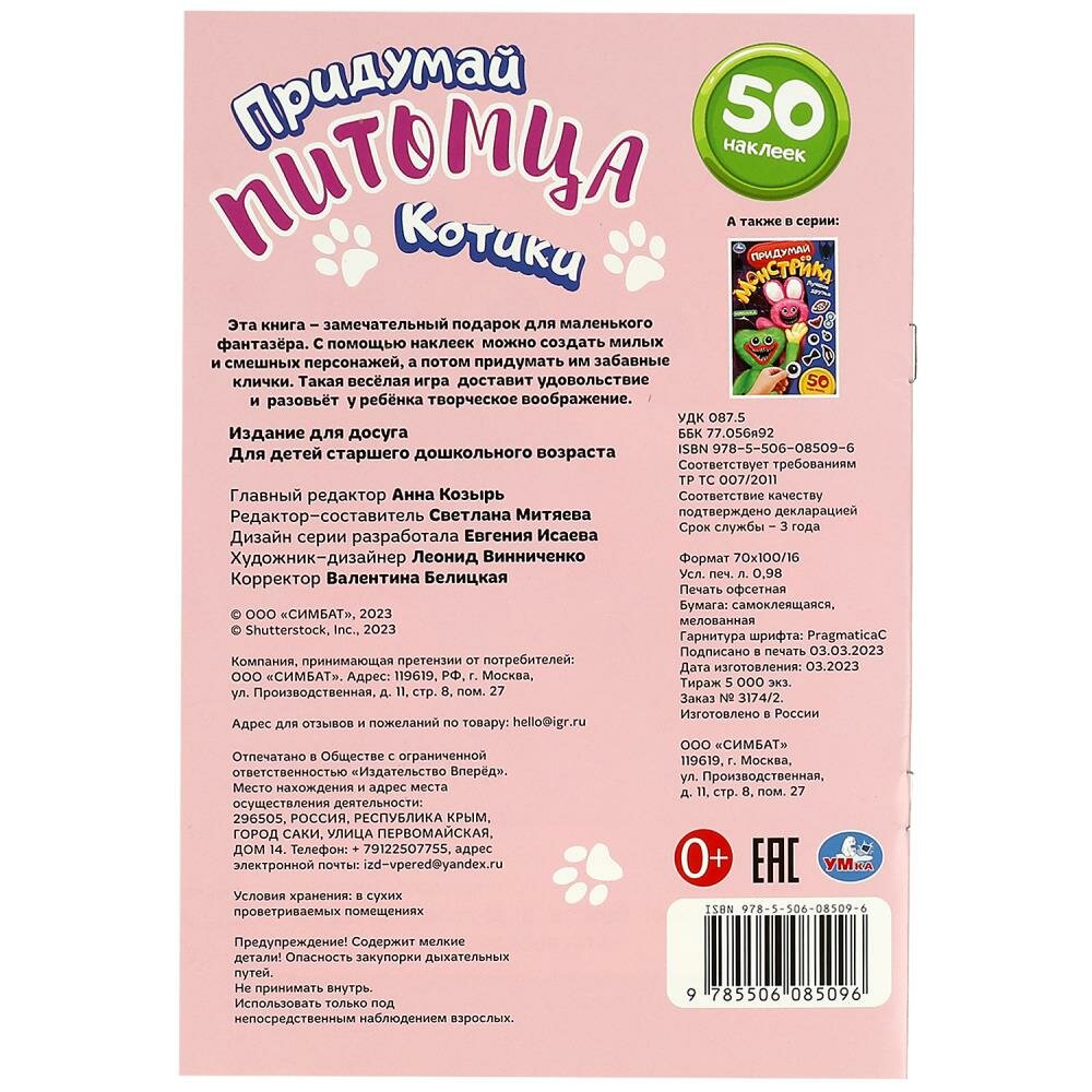 Активити с наклейками «Котики» из серии «Придумай питомца» ТМ «УМка» станет прекрасным подарком для маленького фантазёра:- 50 цветных наклеек- красочные страницы- забавные персонажиС помощью разнообразных наклеек можно создать придумать для себя любого питомца и украсить его стильными аксессуарами. Такая весёлая игра доставит удовольствие и разовьёт у ребёнка творческое воображение и мелкую моторику.Занятия с активити ТМ «УМка» также развивают:- пространственное мышление- внимание- фантазиюОбъём: 8 стр. Формат: 160 х 235 мм.Материал: офсетная бумага + самоклеящаяся бумага.Рекомендовано детям старшего дошкольного возраста.
