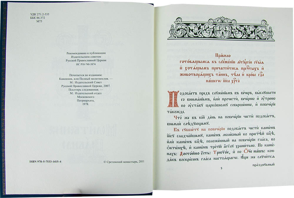 В издание вошли: Правило готовящимся к служению литургии и хотящим причаститися Святых Тайн Повечерие малое Каноны и акафист на повечерии в субботу, в неделю и вторник Акафист Иисусу сладчайшему Каноны и акафист на повечерии в понедельник Акафист Иисусу сладчайшему Каноны и акафист на повечерии в среду Акафист святителю Николаю Каноны и акафист на повечерии в четверток Акафист Иисусу сладчайшему Каноны и акафист на повечерии в пяток Акафист Пресвятой Богородице Молитвы на сон грядущим Молитвы утренния Правило от осквернения Помянник Последование ко Святому причащению Канон ко Святому причащению Молитвы ко Святому причащению Молитвы благодарственные по Святом причащении Часы на Святую Пасху Тропари и кондаки воскресные Тропари, кондаки и величания праздникам Отпустительнии тропари и кондаки триоди Тропари, кондаки и величания общии святым 3-е издание.