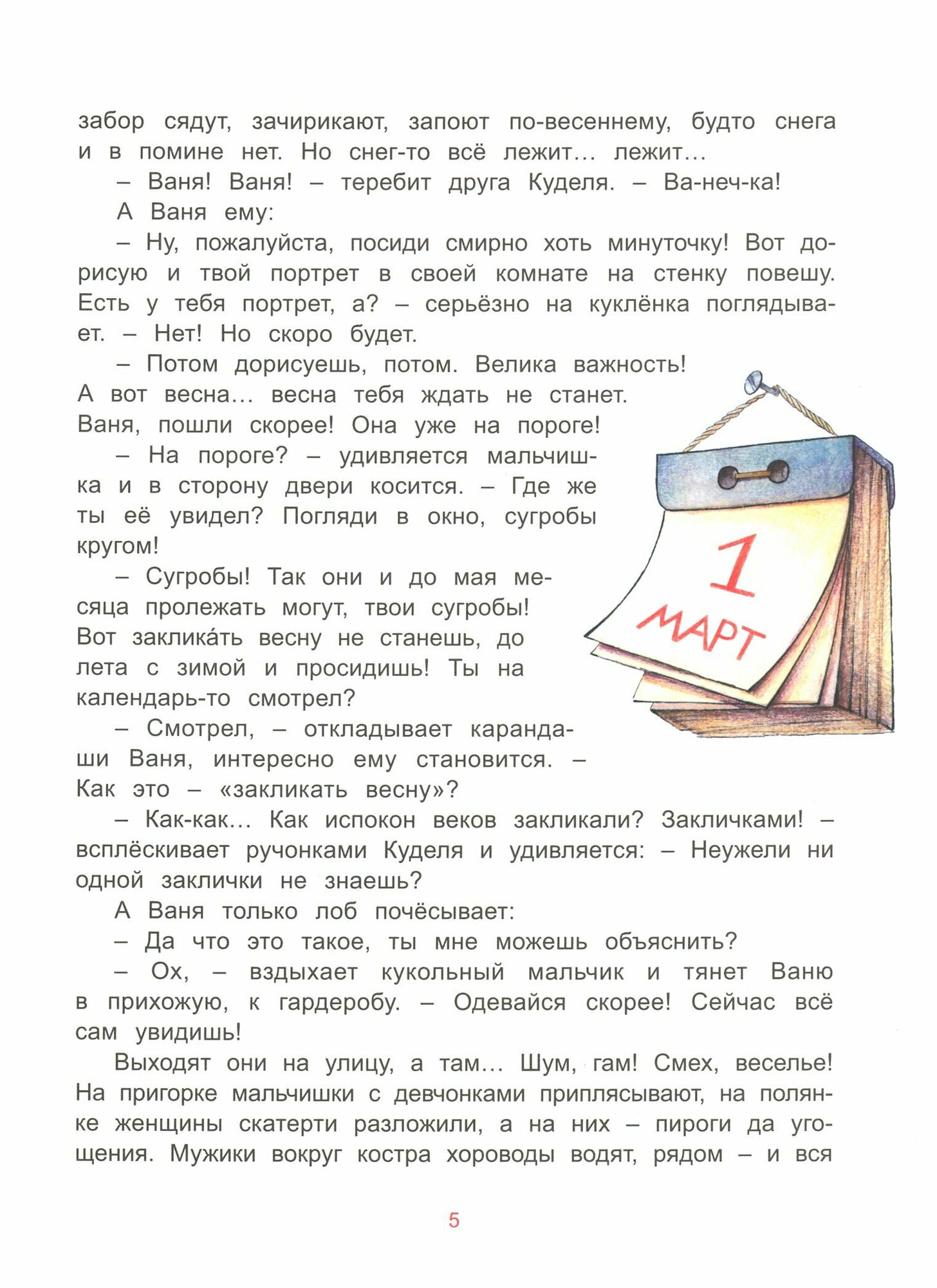 С приближением первых тёплых дней словно новую жизнь вдохнули в деревню, проснулись крестьянские дворы под первыми ласковыми солнечными лучами. Однако видит Ваня, что с трудом весна прокладывает себе дорогу, а вот его друг Куделя не унывает: нужно засучить рукава и приниматься за работу - зиму выпроваживать, весну приглашать, подарками её радовать. Вся деревня трудится ради скорой встречи с весной: кто - у печки, кто - с гостинцами в чистом поле, а кто - и на крыше амбара… И вот уже солнышко ярче улыбается, сугробы тают, речка ото льда освобождается, в небе весёлая птичья песня звенит - верный признак весны. Теперь можно и за другие заботы приниматься: в поля выходить, застоявшихся в хлеву коров на свежую травку выпускать и в лес ехать за первым урожаем, который крестьяне с берёз собирают… Ну и о праздниках забывать не стоит: время-то какое - ясное, радостное, вот и праздники ему под стать - из самых светлых, самых любимых. А там уже и лето не за горами: пролетел год, Ваня оглянуться не успел. И что бы он без своего друга делал - смешного, лохматого и умного-разумного? А у Кудели и на этот вопрос ответ есть. Какой? Да он сам расскажет и покажет, как обычно. Книга адресована детям от 5 лет.