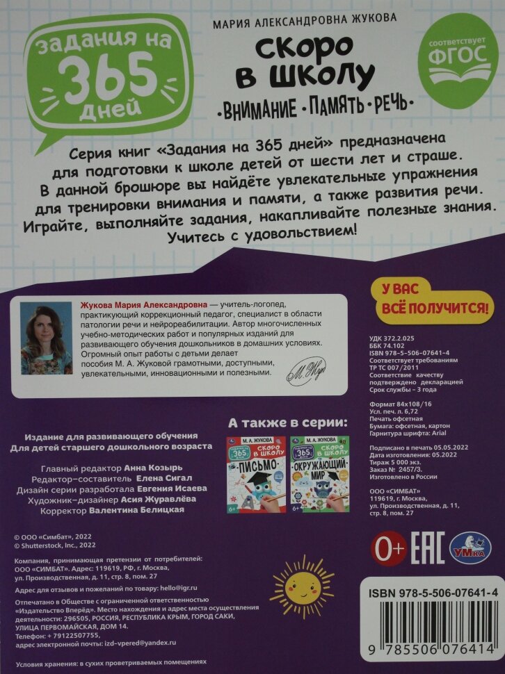 Книга Задания на 365 дней Скоро в школу Внимание Память Речь Жукова М.А. (Жукова Мария Александровна); Умка, 2020