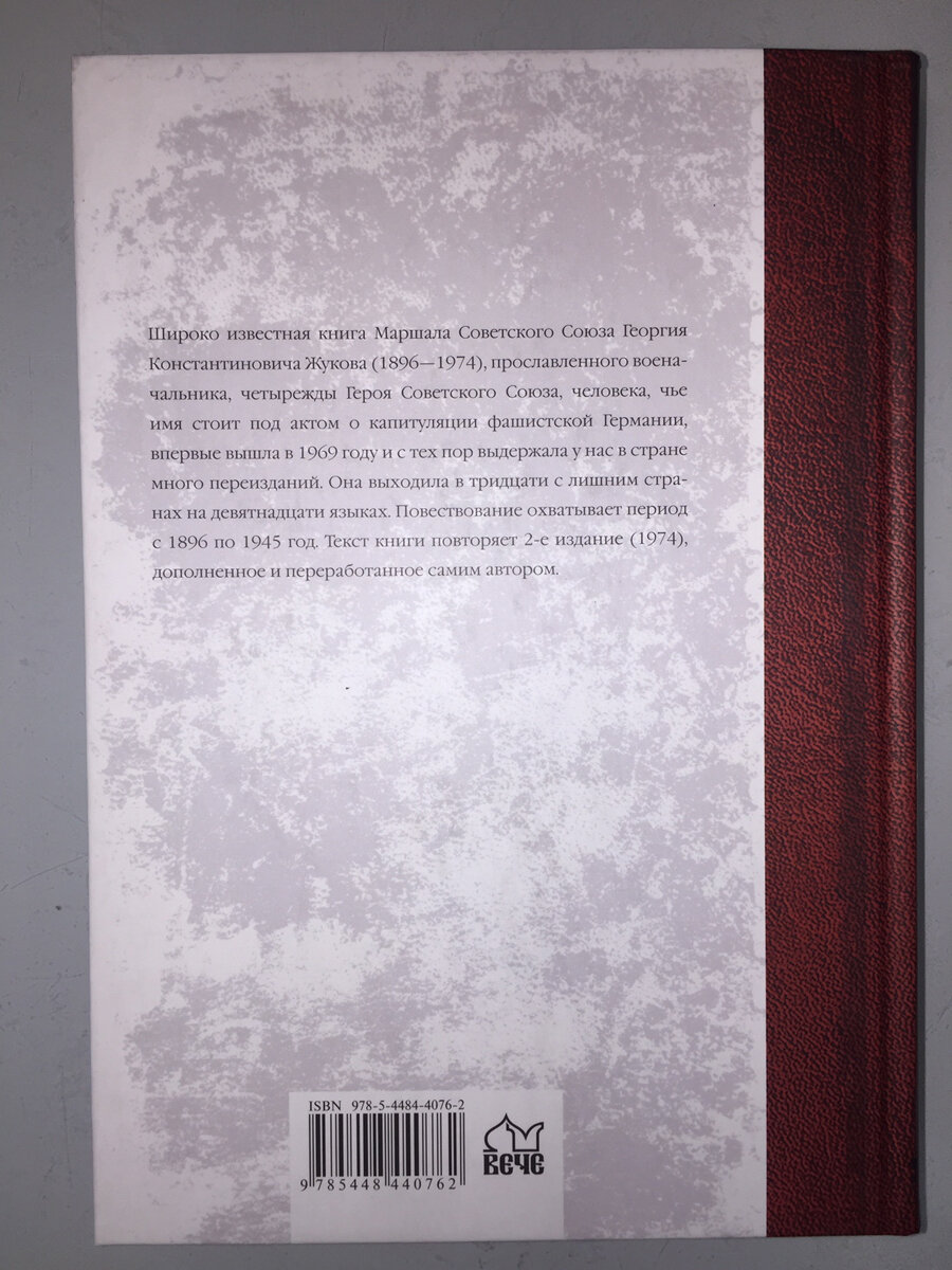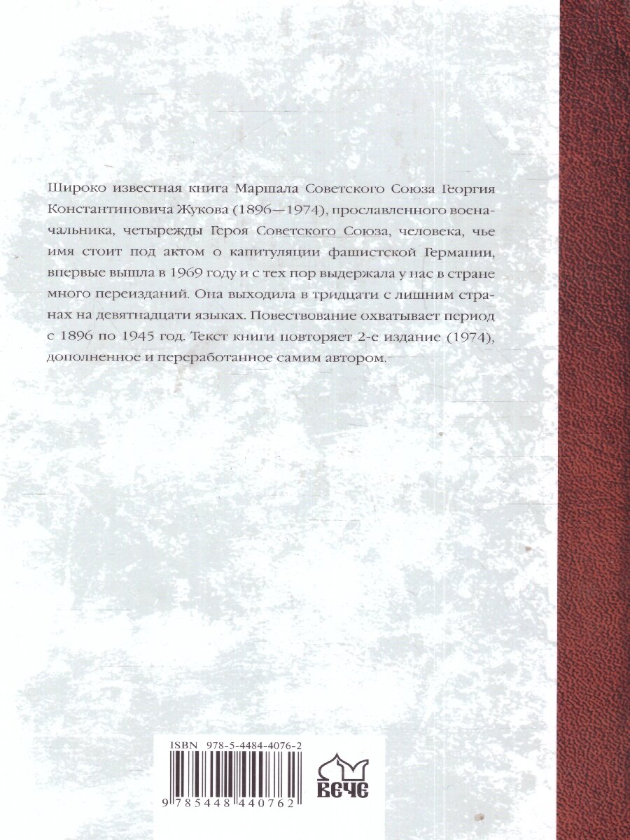 Широко известная книга Маршала Советского Союза Георгия Константиновича Жукова (1896-1974), прославленного военачальника, четырежды Героя Советского Союза, человека, чье имя стоит под актом о капитуляции фашистской Германии, впервые вышла в 1969 году и с тех пор выдержала у нас в стране много изданий. Она была издана в тридцати с лишним странах на девятнадцати языках. Повествование охватывает период с 1896 по 1945 год. Данное издание приурочено к 70-летию победы в Великой Отечественной войне. Текст книги повторяет 2-е издание (1974), дополненное переработанное самим автором.