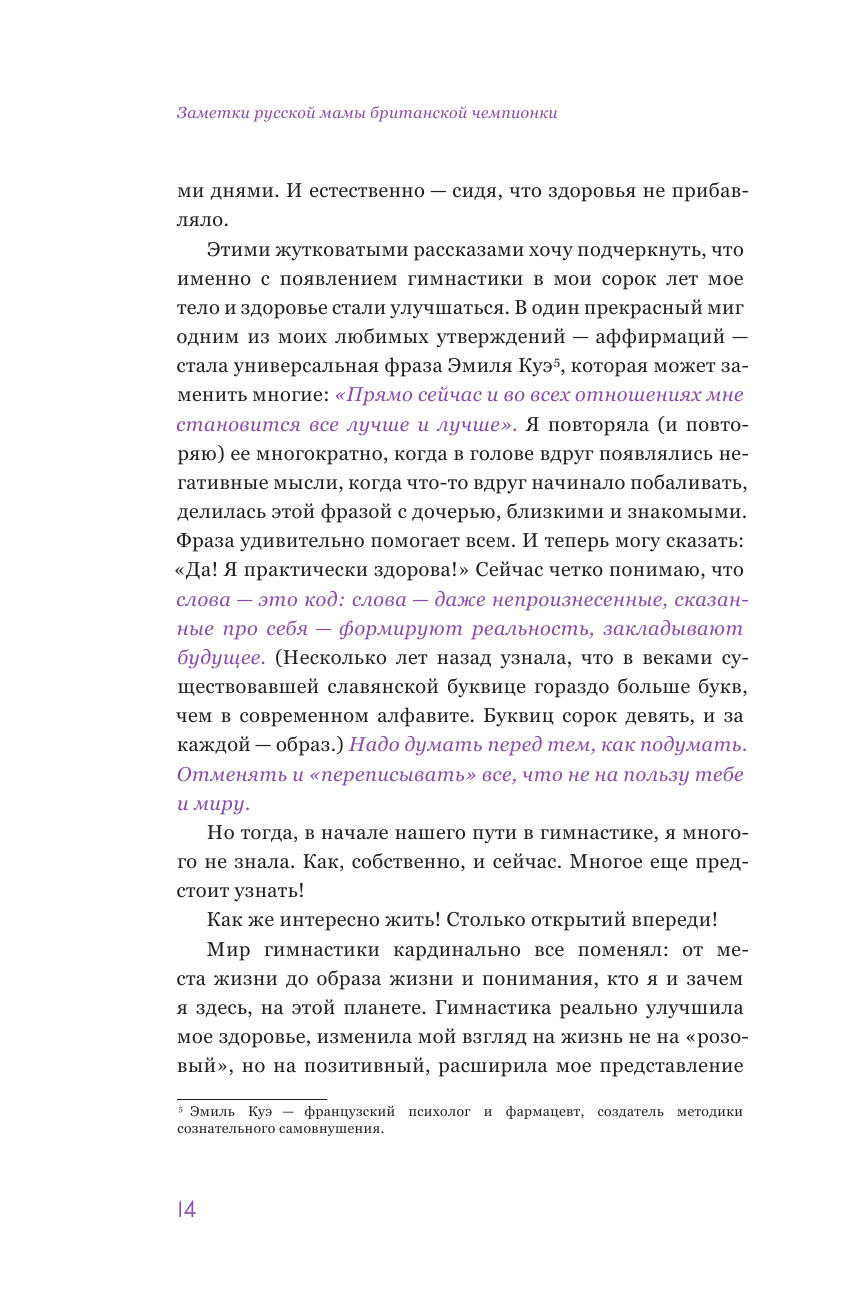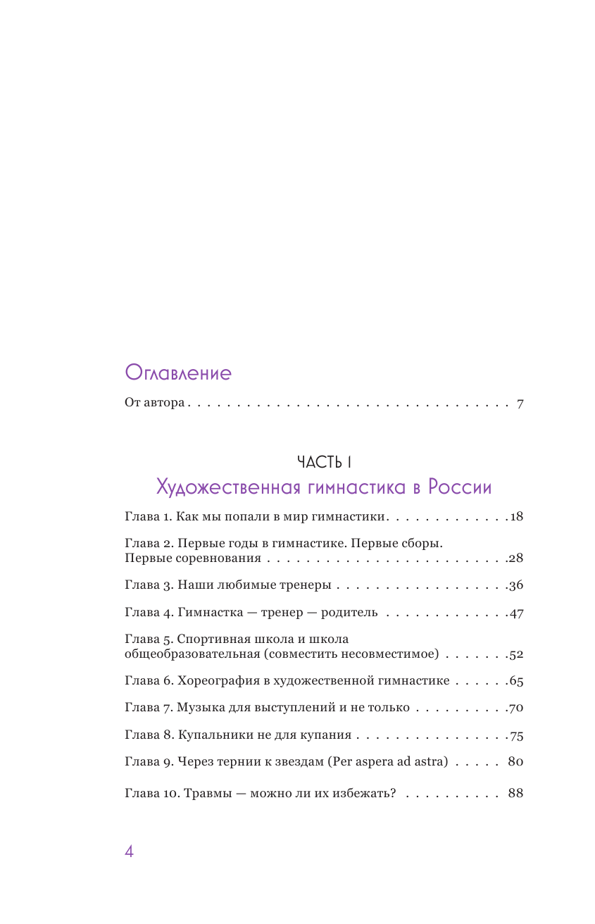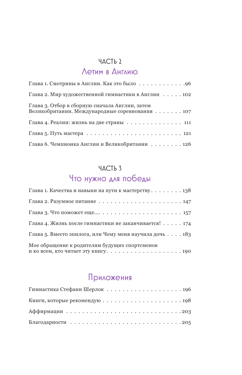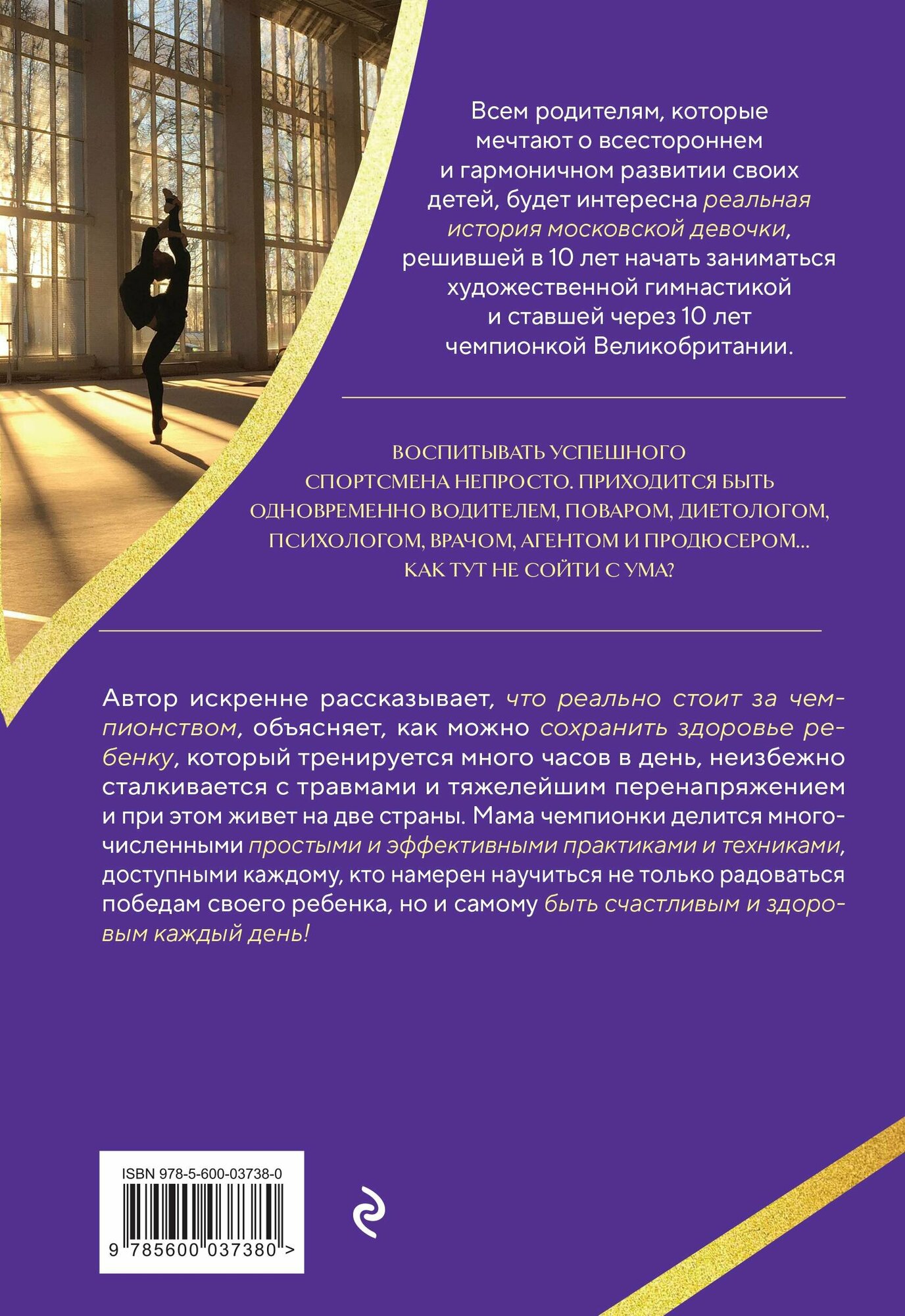 Автор искренне рассказывает, что реально стоит за чемпионством, объясняет, как можно сохранить здоровье ребёнку, который тренируется много часов в день, неизбежно сталкивается с травмами и тяжелейшим телесным и психическим перенапряжением, и при этом живет на две страны. Мама чемпионки делится многочисленными простыми и эффективными практиками и техниками, доступными каждому, кто намерен научиться не только радоваться победам своего ребенка, но и самому быть счастливым и здоровым каждый день!