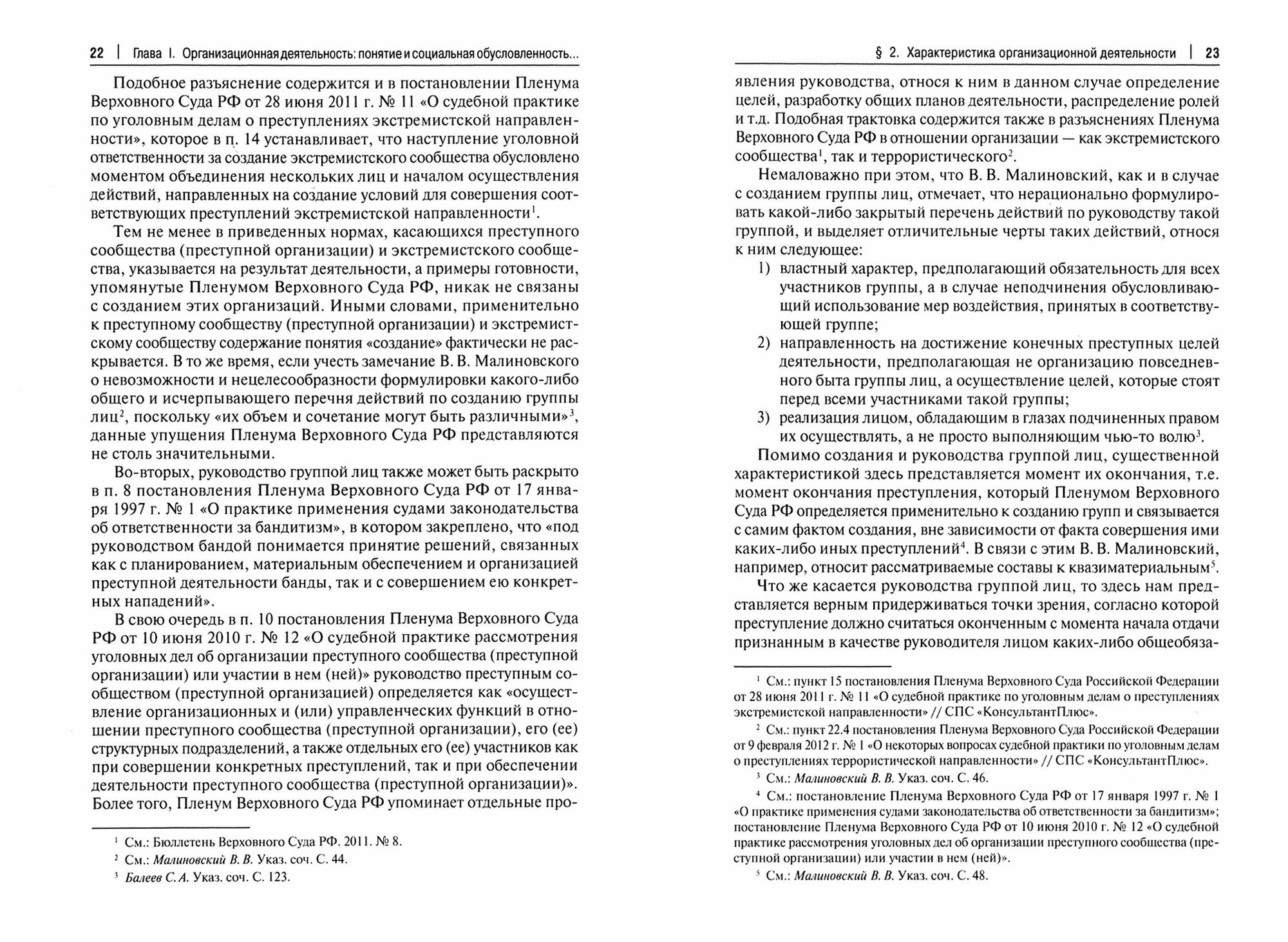 Монография посвящена совершенствованию теории уголовного права в области организационной преступной деятельности путем комплексного исследования входящих в нее теоретических и практических проблем. В работе раскрывается понятие организационной деятельности, дается ее характеристика, выявляются основание и условия социальной обусловленности криминализации организационной деятельности, исследуются актуальные проблемы, связанные с отдельными видами организационной деятельности (ст. 172.2, 205.4, 205.5, 210, 282.1, 282.2, 284.1 и др. УК РФ), на основании чего сформулированы предложения по совершенствованию законодательства, а также выработаны рекомендации по применению соответствующих уголовно-правовых норм.Законодательство приведено по состоянию на 20 декабря 2018 г.Для студентов, аспирантов, преподавателей юридических вузов, научных работников, следователей, прокуроров и судей.