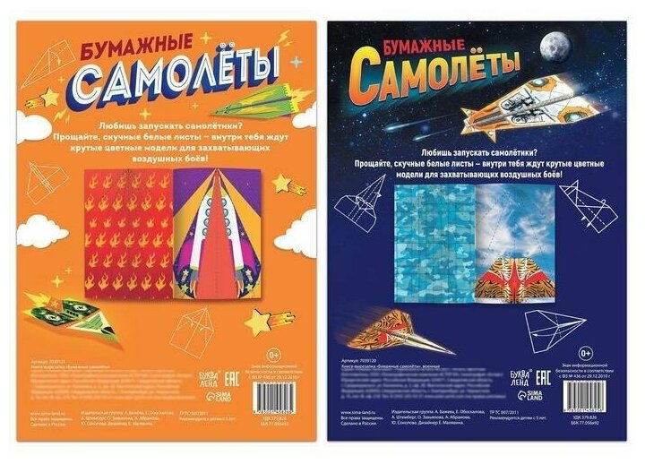 Ваш малыш обожает запускать самолетики? Тогда этот набор книг-вырезалок обязательно ему понравится.Делать воздушные судна нужно будет не из скучных белых листов - внутри ждут крутые цветные модели и пошаговые инструкции к ним.В набор входят 2 книги:* "Бумажные самолеты";* "Бумажные самолеты", военные.У каждой модельки уникальный дизайн. С готовыми поделками можно играть в межгалактические сражения или выполнять секретные воздушные военные операции.Рекомендовано для детей от 5 лет.Комплектация* Книга- вырезалка "Бумажные самолеты"* Книга- вырезалка "Бумажные самолеты", военные