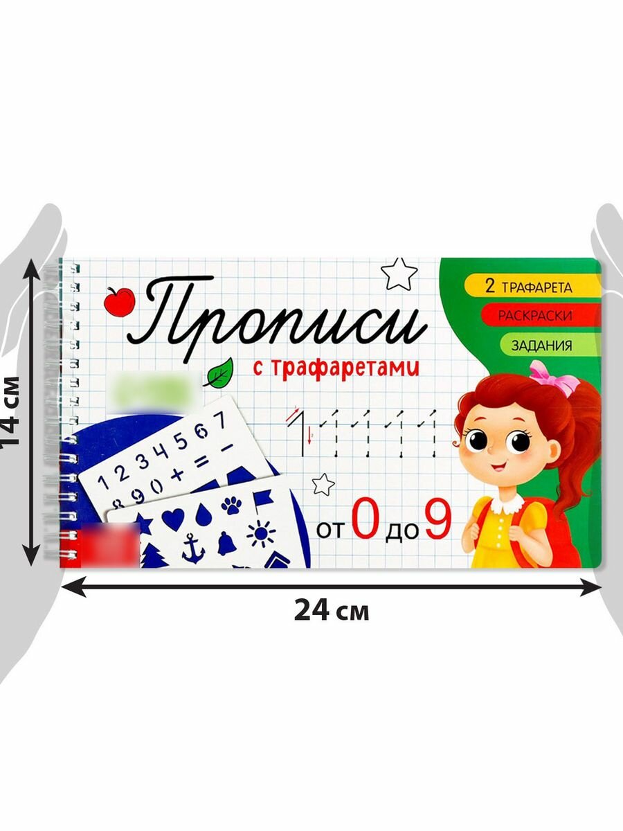Прописи с трафаретами "От 0 до 9"Прописи с трафаретами — это эффективный тренажёр для отработки навыков письма и подготовки малыша к школе.Особенности прописейЛаминированная картонная обложка сохранит надолго аккуратный внешний вид.Много разнообразных заданий: ребёнку предстоит обводить элементы по пунктирным линиям и писать самостоятельно, а также раскрашивать и выполнять другие интересные миссии.2 пластиковых трафарета прикреплены к пружинке. Их можно аккуратно отстегнуть и использовать отдельно от прописей.-Вес: 108 г.-Количество в упаковке: 10-Тип индивидуальной упаковки: Пакет-Длина упаковки: 24.5-Высота упаковки: 1.5-Ширина упаковки: 14-Объем упаковки: 0.515-Объем продукта: 0.2406-Объем бокса: 57.75-Ширина: 14-Высота: 0.2-Габариты товара: 23,8 см × 14 см × 0,2 см-Материал: Бумага, пластик-Набор: Нет-Возраст: От 3 лет, Для детей-Год издания: 2022-Тема обучения: Цифры, счёт, математика-Вид: Прописи-Тематика: Подготовка к школе