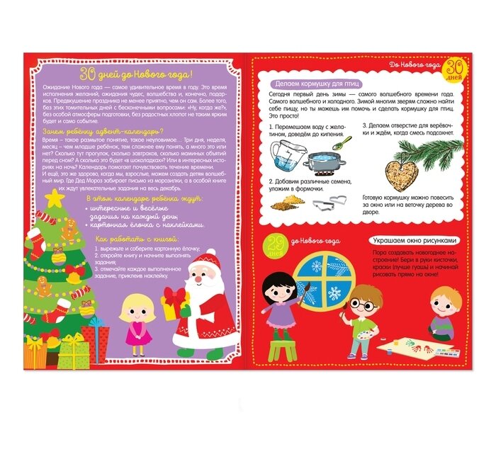 В комплекте 1 шт.Адвент-календарь с наклейками «До Нового года 30 дней» — это верный помощник малыша в изучении окружающего мира. Теперь он сможет:вырезать ёлочку и нарядить её;сделать кормушку для птиц;украсить окно новогодними рисунками;приготовить любимые лакомства Деда Мороза;построить снежную крепость;сделать подарок для Дедушки Мороза;играть в снежки дома;придумать увлекательную новогоднюю историю;научиться рисовать на снегу яркими красками.Родители отмечают каждое выполненное задание малыша с помощью наклеек. Весёлого вам творчества!
