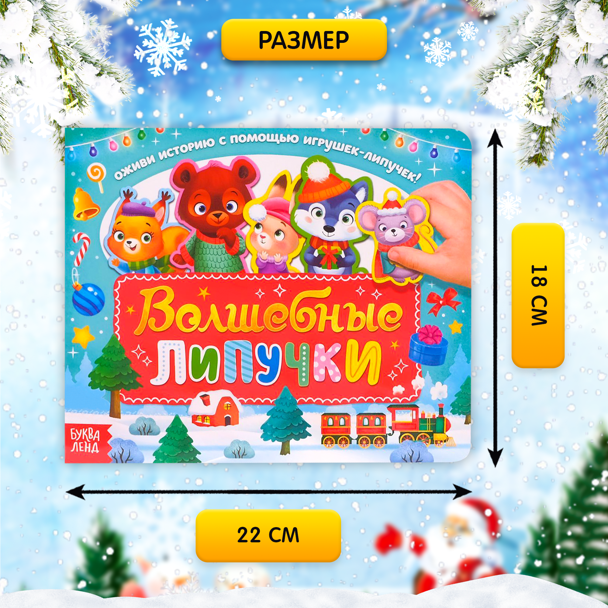 Обучающая книга с липучками направлена на расширение кругозора малыша. Внутри ребёнок найдёт интересные задания и загадки, а также сможет оживить новогоднюю историю с милыми зверятами.Как играть с яркими липучками1. Липучки уже приклеены в книгу и на карточки.2. Малышу необходимо лишь крепить героев на странички.Если случайно потеряется пара липучек, не расстраивайтесь, ведь в комплекте есть запасные.Книга оснащена специальным конвертом для хранения липучек.Для того чтобы обучение было более продуктивным, рекомендуем взрослым заниматься вместе с малышом. Книга предназначена для детей от 3 лет.Комплектация* Картонная книга.* 9 фигурных карточек со зверятами.* Набор твёрдых и мягких липучек на клеевой основе.