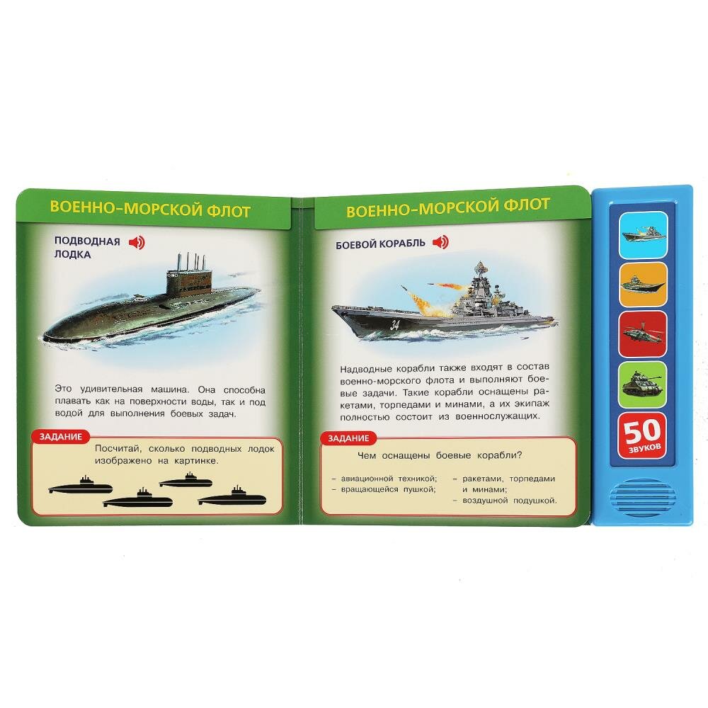 Говорящая энциклопедия «Военная техника» ТМ «УМка» - отличный подарок для юных любознаек:- 5 кнопок- 50 звуков- познавательные факты- задания и вопросы- красочные иллюстрации- отдельная кнопка Вкл./Выкл. на оборотеЭнциклопедия в игровой форме познакомит малыша с видами военной техники. На её страницах ребёнок найдёт короткую информацию о каждом виде и вопросы на закрепление полученных знаний, а при нажатии на звуковые кнопки он сможет послушать, какие звуки эта техника издаёт. Книжка сделана из плотного картона, поэтому родители могут не опасаться за её сохранность. Благодаря компактному формату её удобно брать с собой в путешествие.Говорящая энциклопедия ТМ «УМка» развивает:- слуховое восприятие- фантазию- образное мышление- внимание- памятьОбъём: 10 стр. Формат: 200 х 175 мм. Материал: пластмасса + картон.Работает от 3-х батареек типа LR44 (в комплекте).Рекомендовано детям дошкольного возраста.