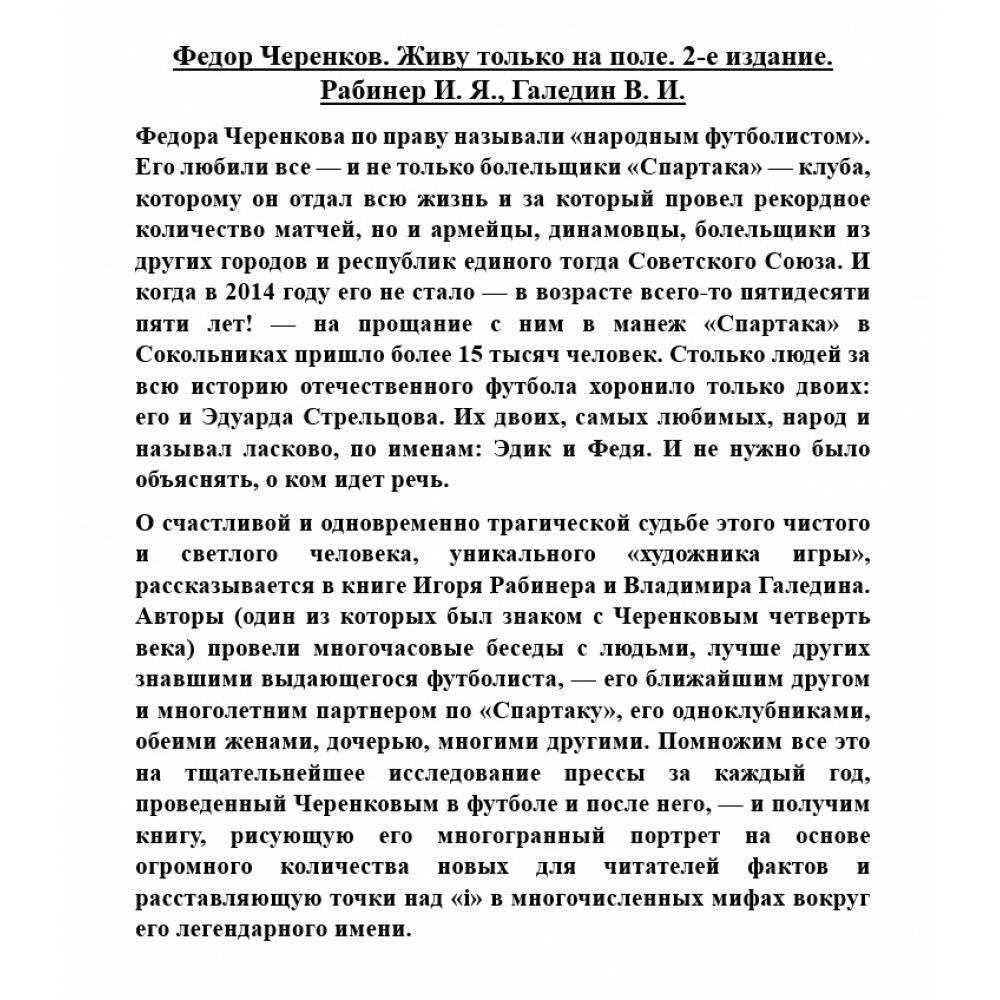 Федора Черенкова по праву называли "народным футболистом". Его любили все - и не только болельщики "Спартака" - клуба, которому он отдал всю жизнь и за который провел рекордное количество матчей, но и армейцы, динамовцы, болельщики из других городов и республик единого тогда Советского Союза. И когда в 2014 году его не стало - в возрасте всего-то пятидесяти пяти лет! - на прощание с ним в манеж "Спартака" в Сокольниках пришло более 15 тысяч человек. Столько людей за всю историю отечественного футбола хоронило только двоих: его и Эдуарда Стрельцова. Их двоих, самых любимых, народ и называл ласково, по именам: Эдик и Федя. И не нужно было объяснять, о ком идет речь. О счастливой и одновременно трагической судьбе этого чистого и светлого человека, уникального "художника игры", рассказывается в книге Игоря Рабинера и Владимира Галедина. Авторы (один из которых был знаком с Черенковым четверть века) провели многочасовые беседы с людьми, лучше других знавшими выдающегося футболиста, - его ближайшим другом и многолетним партнером по "Спартаку", его одноклубниками, обеими женами, дочерью, многими другими. Помножим все это на тщательнейшее исследование прессы за каждый год, проведенный Черенковым в футболе и после него, - и получим книгу, рисующую его многогранный портрет на основе огромного количества новых для читателей фактов и расставляющую точки над "i" в многочисленных мифах вокруг его легендарного имени.