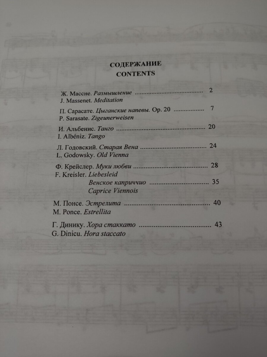 Сборник включает известнейшие сочинения для скрипки и фортепиано Массне, Сарасате, Альбениса, Годовского, Крейслера, Понсе, Динику. Для студентов музыкальных училищ и консерваторий, а также для концертного исполнения.