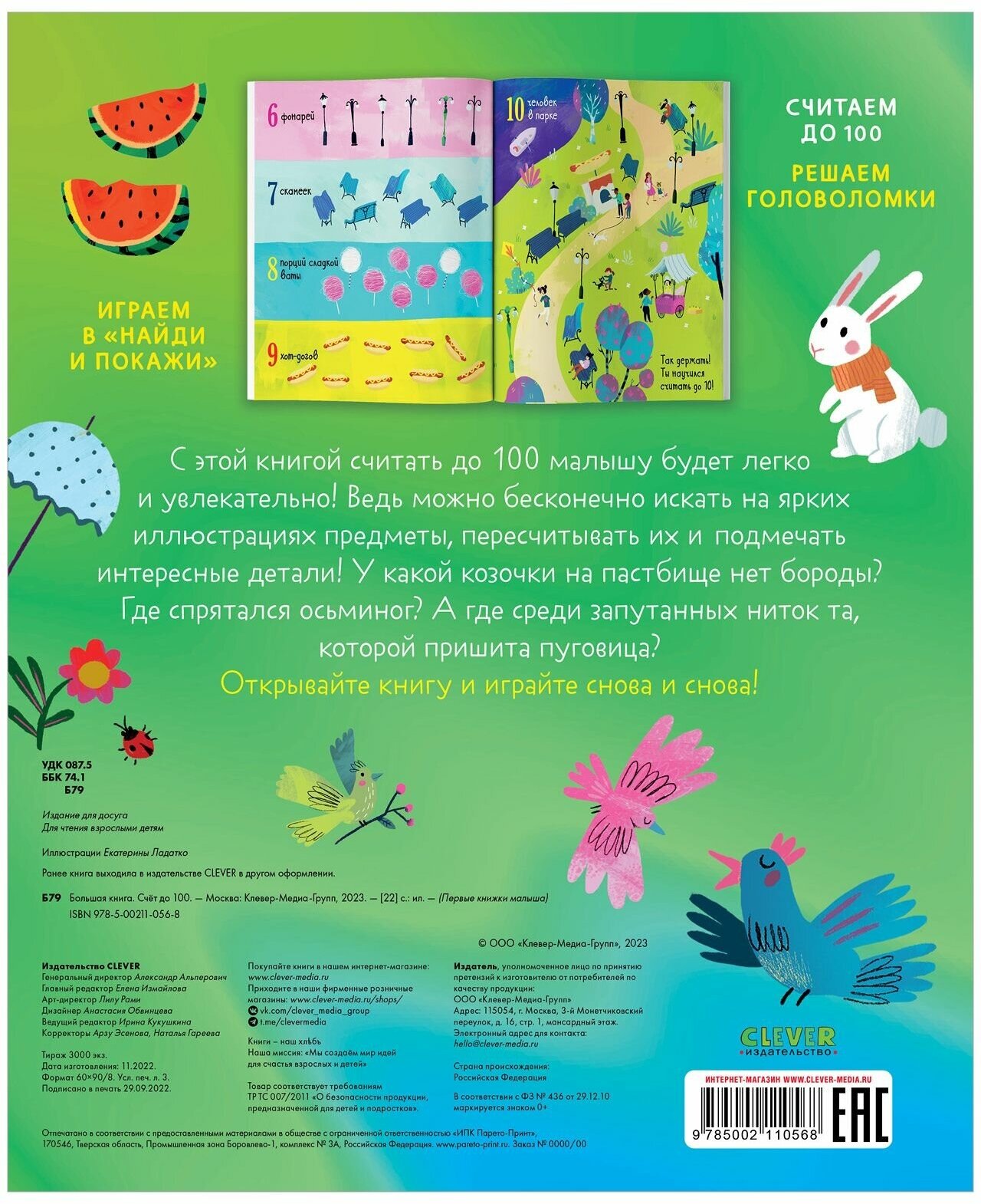 Большая книга. Счет до 100 С этой книгой считать до 100 малышу будет легко и увлекательно! Ведь можно бесконечно искать на ярких иллюстрациях предметы, пересчитывать их и подмечать интересные детали! У какой козочки на пастбище нет бороды? Где спрятался осьминог? А где среди запутанных ниток та, которой пришита пуговица? Открывайте книгу и играйте снова и снова!