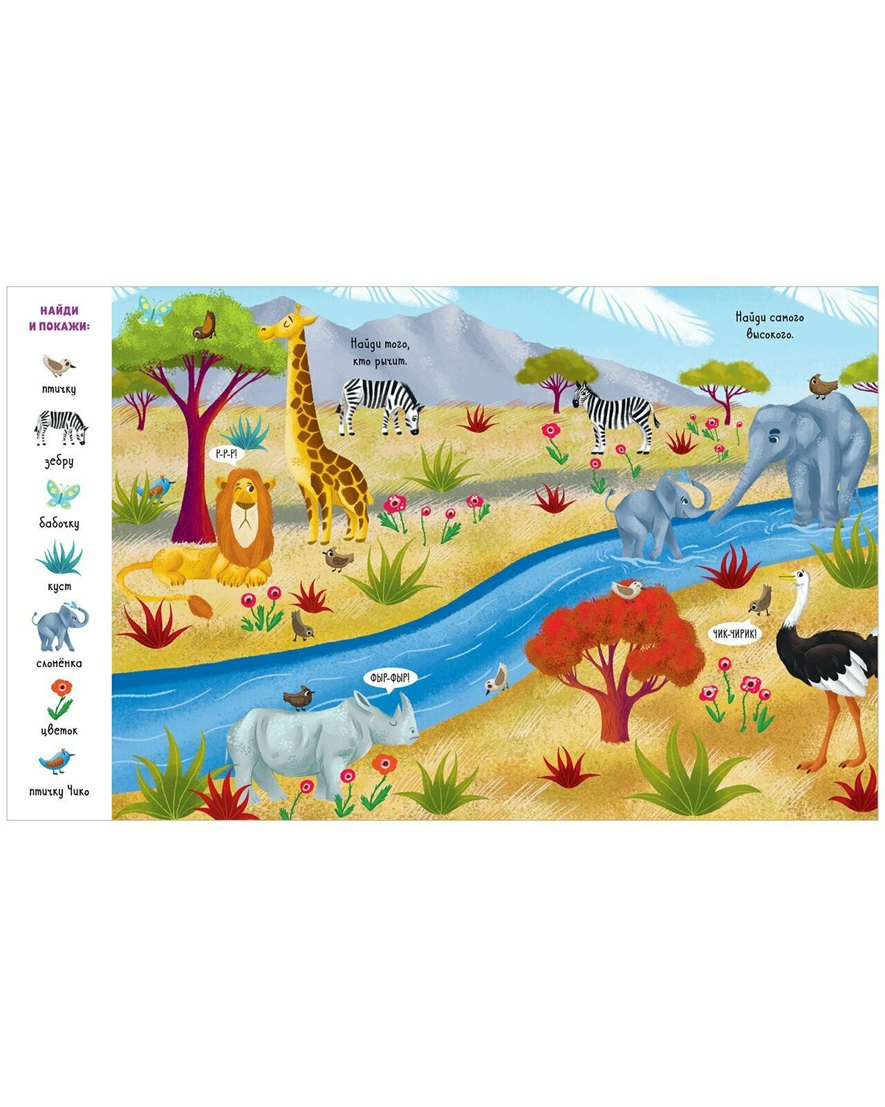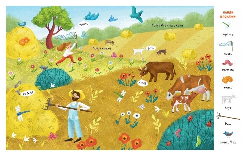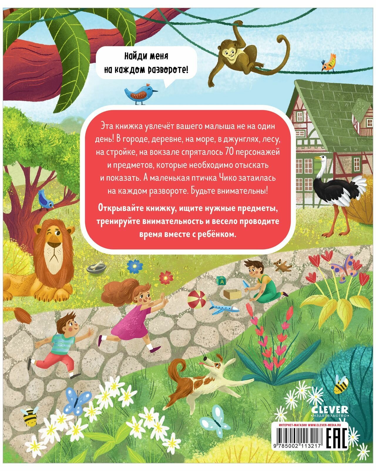 Эта книжка увлечёт вашего малыша не на один день! В городе, деревне, на море, в джунглях, лесу, на стройке, на вокзале спряталось 70 персонажей и предметов, которые необходимо отыскать и показать. А маленькая птичка Чико затаилась на каждом развороте. Будьте внимательны! Открывайте книжку, ищите нужные предметы,тренируйте внимательность и весело проводите время вместе с ребёнком.