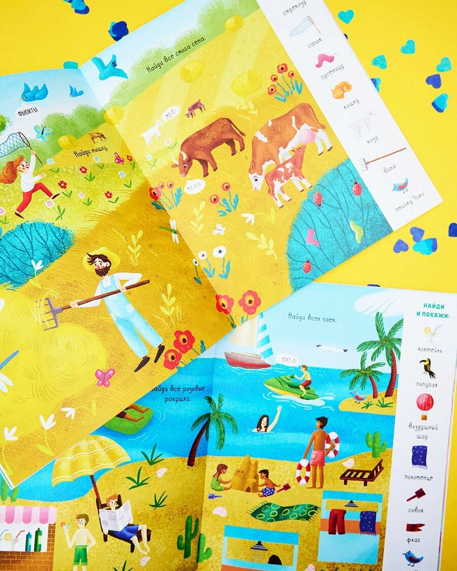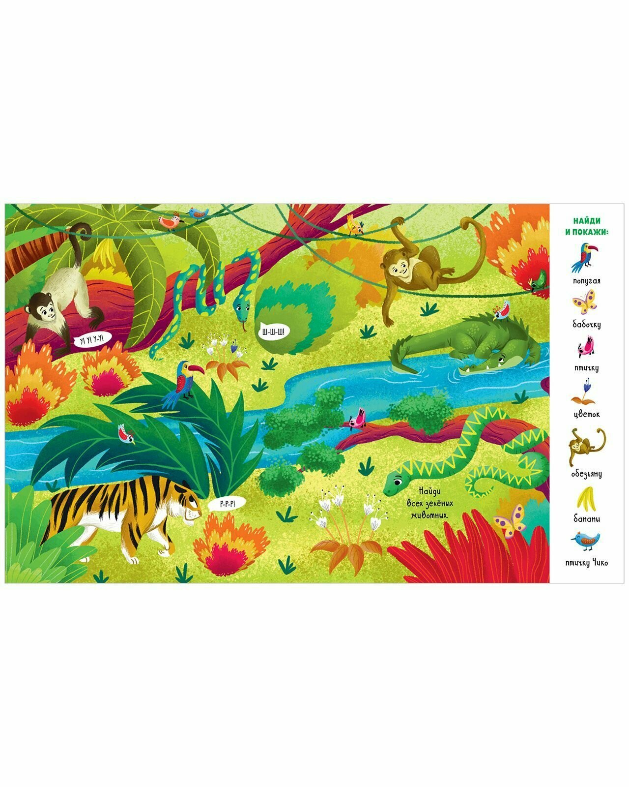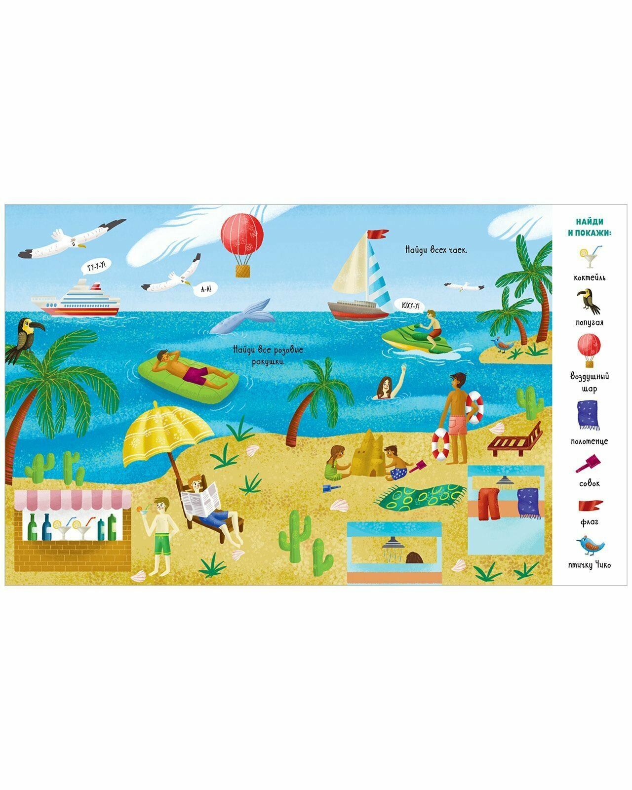 Эта книжка увлечёт вашего малыша не на один день! В городе, деревне, на море, в джунглях, лесу, на стройке, на вокзале спряталось 70 персонажей и предметов, которые необходимо отыскать и показать. А маленькая птичка Чико затаилась на каждом развороте. Будьте внимательны! Открывайте книжку, ищите нужные предметы,тренируйте внимательность и весело проводите время вместе с ребёнком.