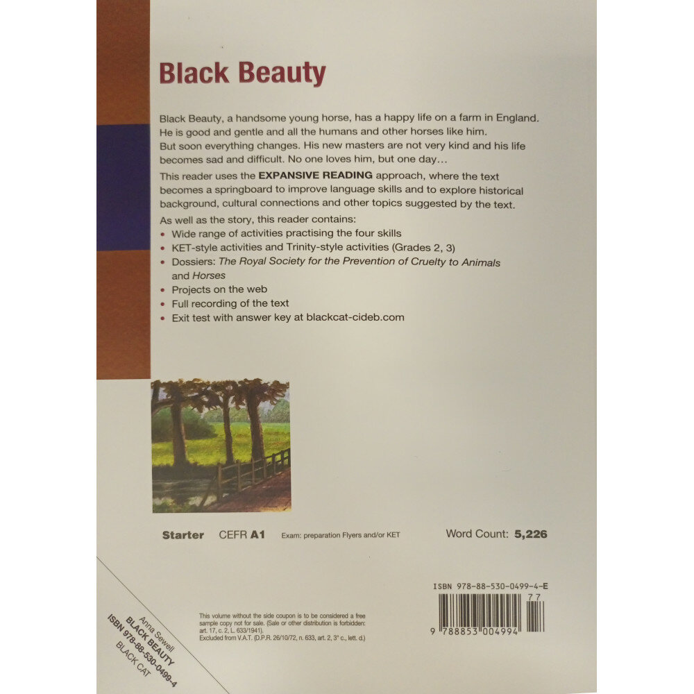 Anna Sewell Adaptation by Gina D. B. ClemenHuman interestBlack Beauty is a touching story written from a horse's point of view. Black Beauty, a handsome, intelligent horse, lives in Victorian England on a peaceful farm with a wonderful master.But his life changes when he is sold to different masters-some are kind and understanding, but others are very cruel…Published in 1877, Black Beauty is surely the most loved animal story of all times – an unforgettable classic for readers of all ages. Dossiers:HorsesThe Royal Society for Protection of Cruelty to Animals Exit test