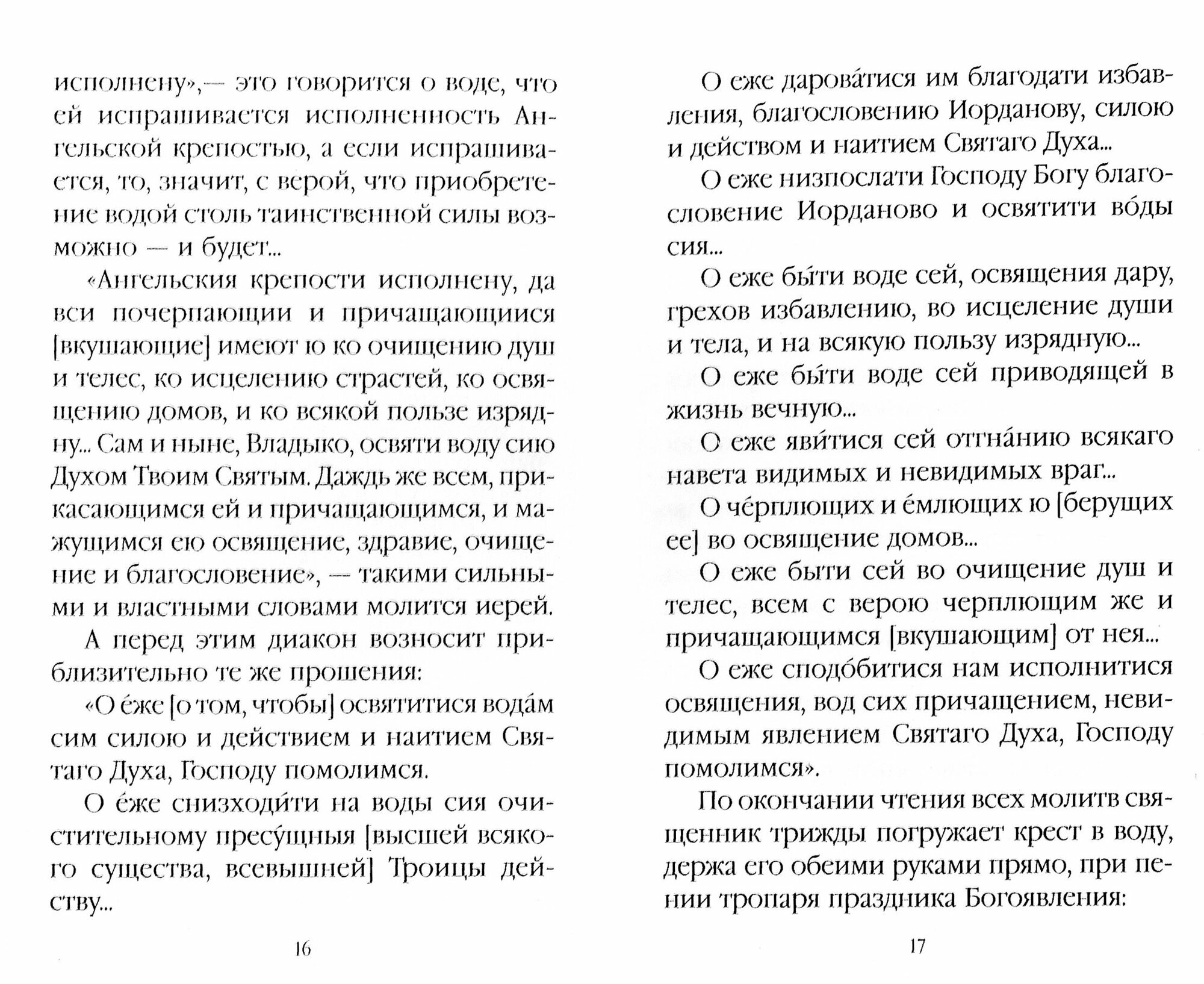 Одной из важнейших сторон церковной жизни является окропление святой водой помещений, предметов быта. Святую воду добавляют в пищу. Зачем Церковь освящает воду? Почему Церковь молится на водных источниках? Как и когда происходит чин Великого освящения воды? На эти и другие вопросы новоначальных дает ответ наша книга. Содержание: Об использовании святой воды Как было впервые совершено освящение воды Зачем Церковь освящает воду Как происходит великое водоосвящение Как освящают воду на молебне, заказанном верующими Почему Церковь молится о водных источниках Молитва на принятие просфоры и святой воды Молитвы при окроплении дома святой водой.