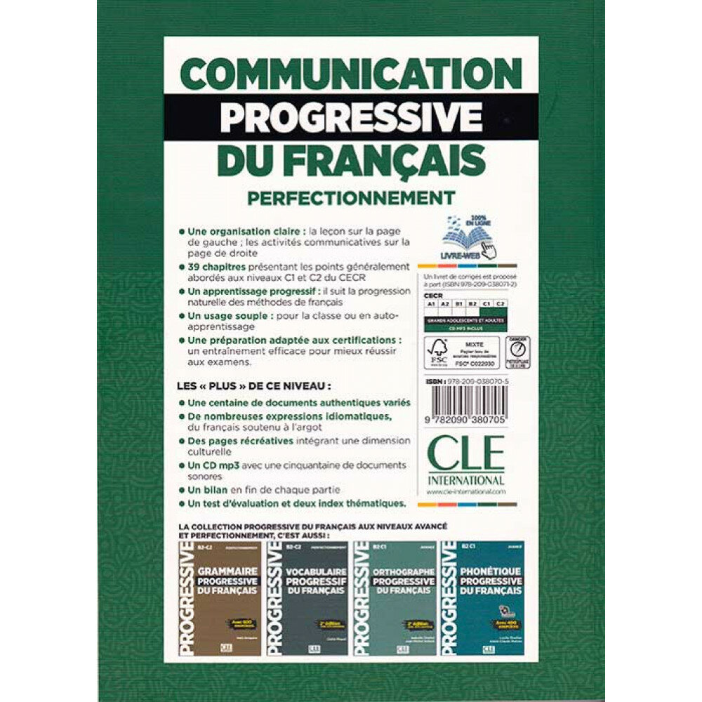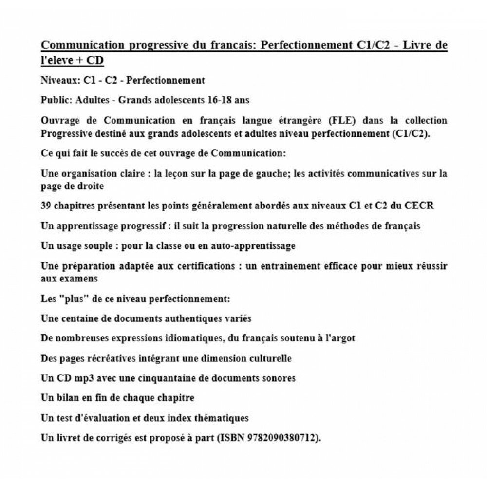 Communication progressive du francais: Perfectionnement C1/C2 - Livre de l'eleve + CD. Niveaux: C1 - C2 - Perfectionnement. Public: Adultes - Grands adolescents 16-18 ans. Ouvrage de Communication en francais langue etrangere (FLE) dans la collection Progressive destine aux grands adolescents et adultes niveau perfectionnement (C1/C2). Ce qui fait le succes de cet ouvrage de Communication: Une organisation claire: la lecon sur la page de gauche; les activites communicatives sur la page de droite. 39 chapitres presentant les points generalement abordes aux niveaux C1 et C2 du CECR. Un apprentissage progressif: il suit la progression naturelle des methodes de francais. Un usage souple: pour la classe ou en auto-apprentissage. Une preparation adaptee aux certifications: un entrainement efficace pour mieux reussir aux examens. Les "plus" de ce niveau perfectionnement: Une centaine de documents authentiques varies. De nombreuses expressions idiomatiques, du francais soutenu a l'argot. Des pages recreatives integrant une dimension culturelle. Un CD mp3 avec une cinquantaine de documents sonores. Un bilan en fin de chaque chapitre. Un test d'evaluation et deux index thematiques. Un livret de corriges est propose a part (ISBN 9782090380712). Communication progressive du francais: Учебник с CD и онлайн-кодом. Уровень: C1 - C2 - Повышение Квалификации. Аудитория: взрослые-взрослые подростки 16-18 лет. Учебное пособие по коммуникации на французском иностранном языке (FLE) в коллекции Progressive, предназначенное для взрослых и подростков с высшим образованием (C1/C2). Что делает эту работу по коммуникации успешной: Четкая структура: урок на левой странице; коммуникативная деятельность на правой странице. 39 глав, в которых представлены вопросы, обычно обсуждаемые на уровнях C1 и C2 CEFR. Прогрессивное обучение: оно следует естественной последовательности методов изучения французского языка. Гибкое использование: для занятий или самостоятельного обучения. Подходит для подготовки к сертификации: эффективная подготовка для лучшей сдачи экзаменов. "Плюсы" этого уровня развития: Сотня разнообразных подлинных текстов. Множество идиоматических выражений, от устойчивых французских до жаргонных. Развлекательные страницы, включающие культурное направление. Компакт-диск в формате mp3 с пятьюдесятью звуковыми дорожками. Подведение итогов в конце каждой главы. Один оценочный тест и два тематических задания. Отдельно предлагается буклет с ответами (ISBN 9782090380712).
