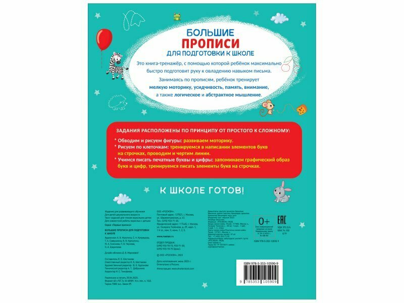 Это книга-тренажёр, с помощью которой ребёнок максимально быстро подготовит руку к овладению навыком письма.Занимаясь по прописям, ребёнок тренирует мелкую моторику, усидчивость, память, внимание, а также логическое и абстрактное мышление.Задания расположены по принципу от простого к сложному:- Развиваем моторику: обводим и рисуем фигуры.- Рисуем по клеточкам: тренируемся в написании элементов букв на строчках, проводим и чертим линии.- Учимся писать печатные буквы и цифры: запоминаем графический образ букв и цифр, тренируемся писать элементы букв на строчках. К школе готов!