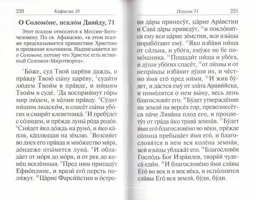 Данное издание, помимо древнего текста, содержит неоценимое наследие - опыт употребления Псалтири великими современными подвижниками - преподобным Арсением Каппадокийским и Паисием Святогорцем. Святые, читая псалмы во многих жизненных обстоятельствах: проблемах, болезнях, испытаниях, - совершали силою Божией истинные чудеса. В книге читатель сможет найти поучения старца Паисия о пользе чтения Псалтири в различных обстоятельствах жизни, а также полный список с указанием прошений: по каким поводам молились преподобные отцы, читая каждый псалом.