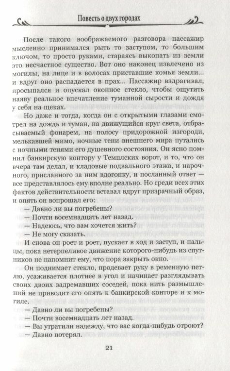 Эмоциональный и захватывающий путеводитель во времена Французской революции. Умело передана атмосфера того времени. Персонажи книги ярки и запоминаются, их индивидуальные истории переплетаются, создавая богатую и многогранную сюжетную линию. Ч.Диккенс показывает нам трагические взаимосвязи между Лондоном и Парижем, двумя городами, которые, кажется, находятся на разных полюсах. История любви и предательства, страсти и страдания, рождающаяся в бурных временах революции, заставляет переживать каждое событие вместе с героями.