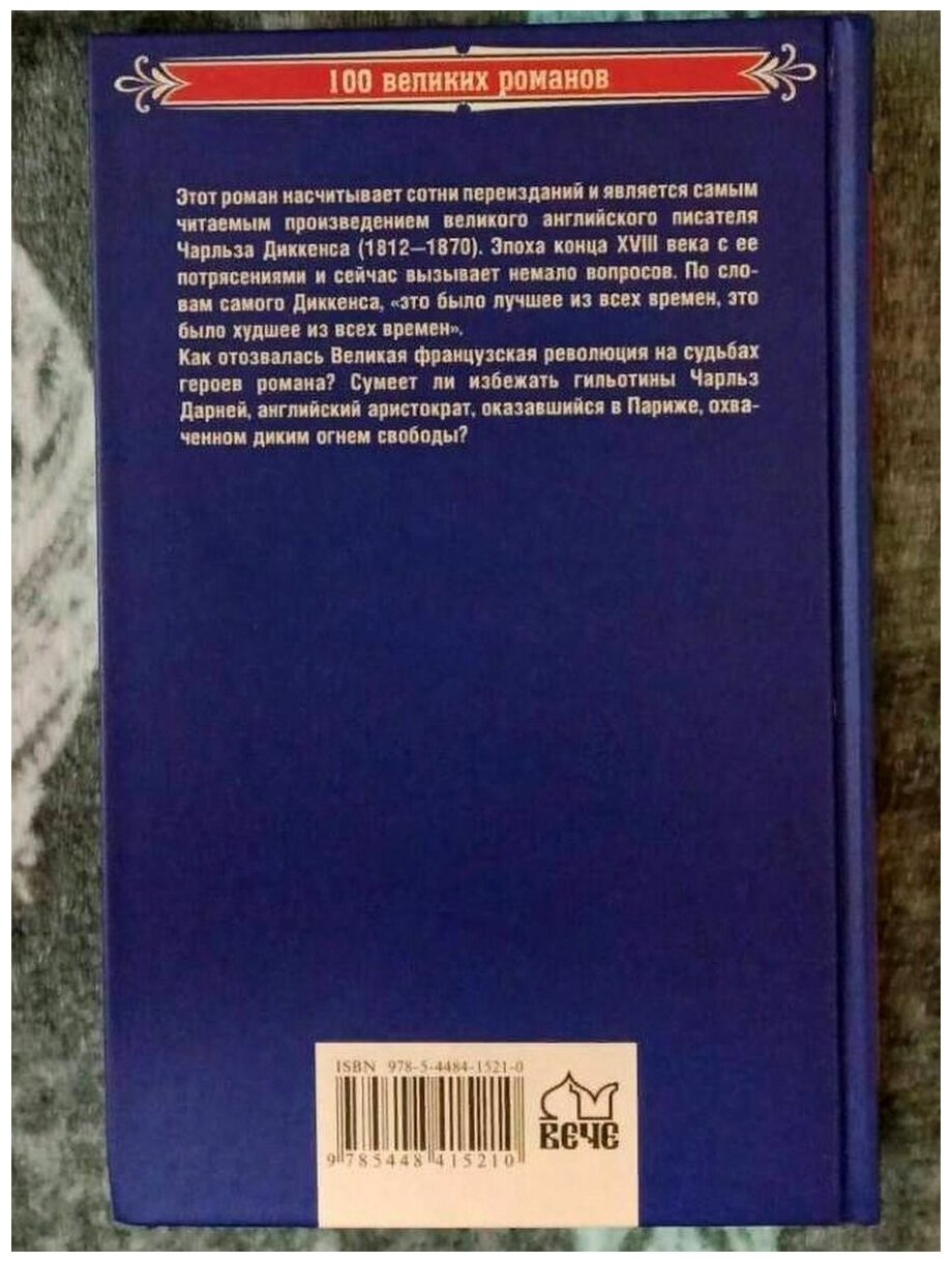 Этот роман насчитывает сотни переизданий и является самым читаемым произведением великого английского писателя Чарльза Диккенса (1812-1870). Эпоха конца XVIII века с ее потрясениями и сейчас вызывает немало вопросов. По словам самого Диккенса, " это было лучшее из всех времен, это было худшее из всех времен". Как отозвалась Великая французская революция на судьбах героев романа? Сумеет ли избежать гильотины Чарльз Дарней, английский аристократ, оказавшийся в Париже, охваченном диким огнем свободы?