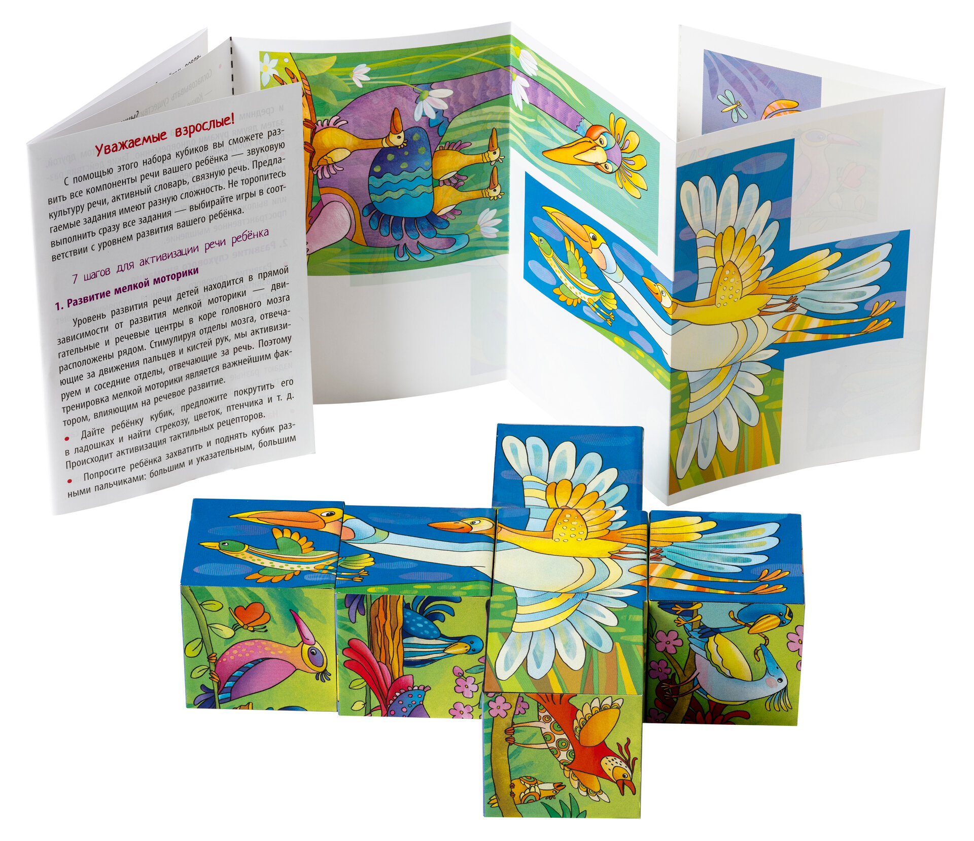 Набор состоит из 6 кубиков, из которых можно сложить 6 картинок с изображением сказочных птиц. Особенность кубиков в том, что картинки складываются в форме не только привычного прямоугольника, но и других фигур. Благодаря различным наполнителям каждый кубик издаёт свой звук. Ребёнок учится различать звуки, их громкость, отбивать ритм, слушает ритмические стихи. В процессе игры развиваются фонематический слух, активная речь, мышление, умение работать по образцу, происходит знакомство с понятиями "часть и целое". Наклейки на кубики сделаны из качественной гладкой бумаги, которая не портится от игры.Адресовано детям от 3 до 5 лет.