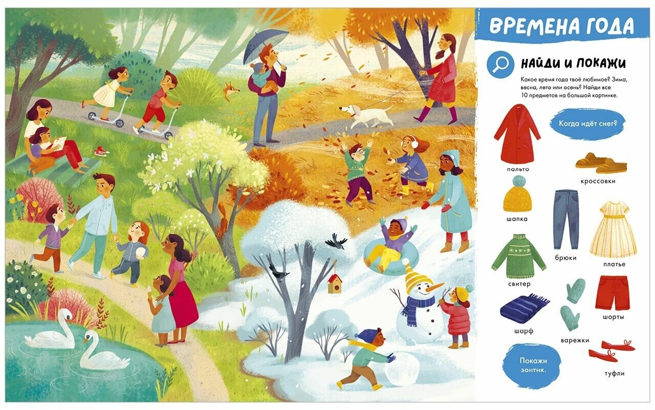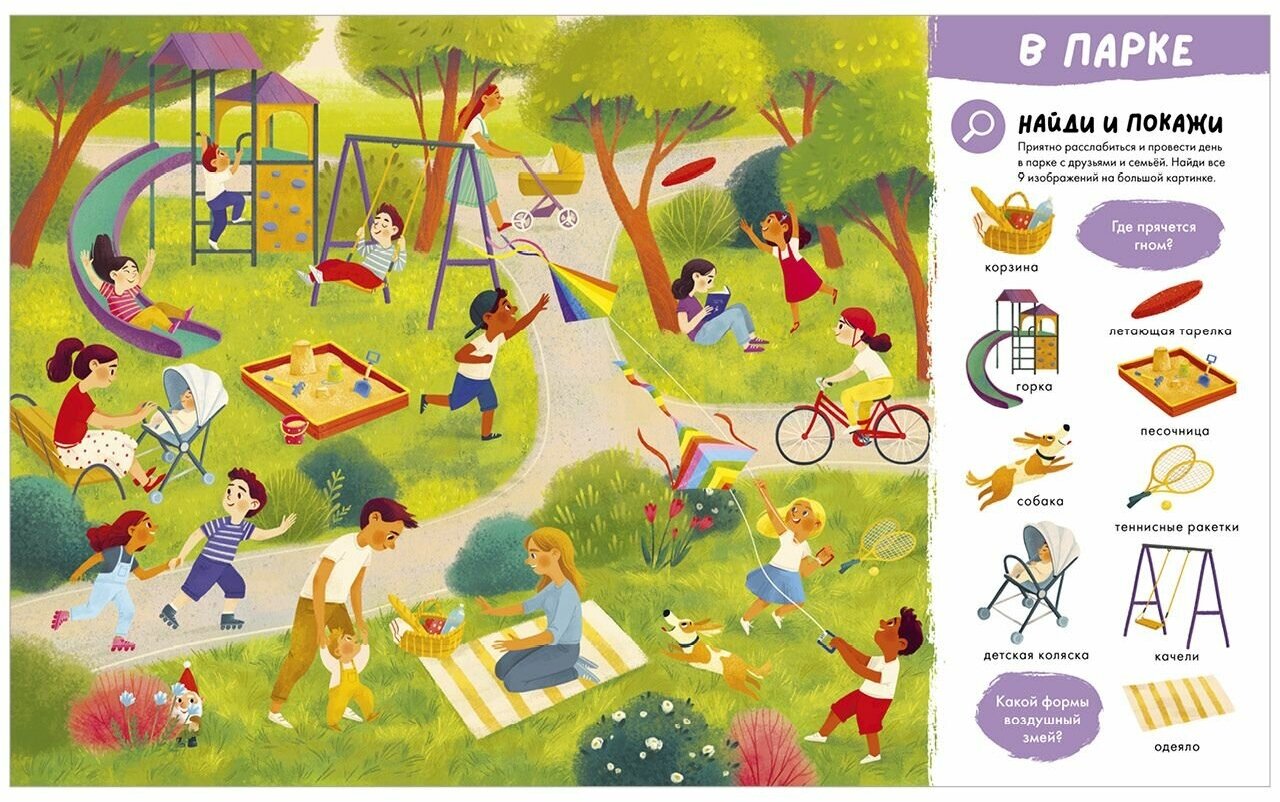Эта книга обязательно понравится вашему малышу, ведь учить новые слова по ней одно удовольствие! Где спряталась собака? На какой крыше сидит котёнок? Сколько тыкв в огороде? Яркие разворотные иллюстрации можно рассматривать бесконечно и придумывать с ними множество историй и игр. Отправляйтесь в захватывающее путешествие: побывайте в зоопарке, в цирке, на пляже и под водой, загляните в магазин и на ферму! Новые слова повсюду. Интереснее всего их узнавать, играя в любимую всеми игру "найди и покажи" и выполняя весёлые задания.
