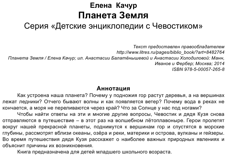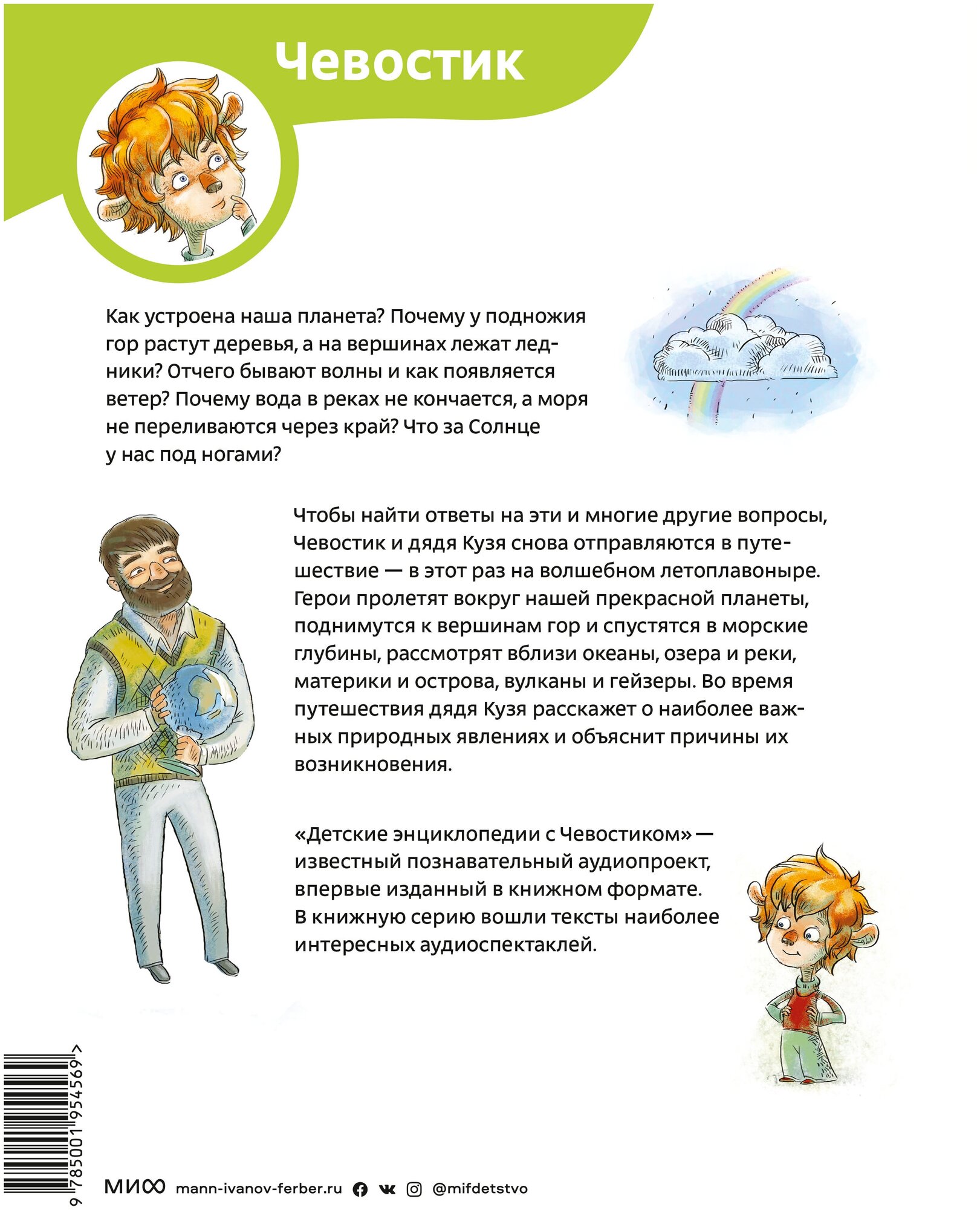 Как устроена наша планета? Почему у подножия гор растут деревья, а на вершинах лежат ледники? Отчего бывают волны и как появляется ветер? Почему вода в реках не кончается, а моря не переливаются через край? Что за Солнце у нас под ногами? Чтобы найти ответы на эти и многие другие вопросы, Чевостик и дядя Кузя снова отправляются в путешествие - в этот раз на волшебном летоплавоныре. Герои пролетят вокруг нашей прекрасной планеты, поднимутся к вершинам гор и спустятся в глубины океанов, рассмотрят вблизи океаны, озера и реки, материки и острова, вулканы и гейзеры. Во время путешествия дядя Кузя расскажет о наиболее важных природных явлениях и объяснит причины их возникновения. Кто такой Чевостик? Чевостик - главный герой известного аудиопроекта. В серии "Аудиоэнциклопедии с Чевостиком" вышло уже 46 спектаклей. И мы рады представить вам лучшие из них в книжном формате!