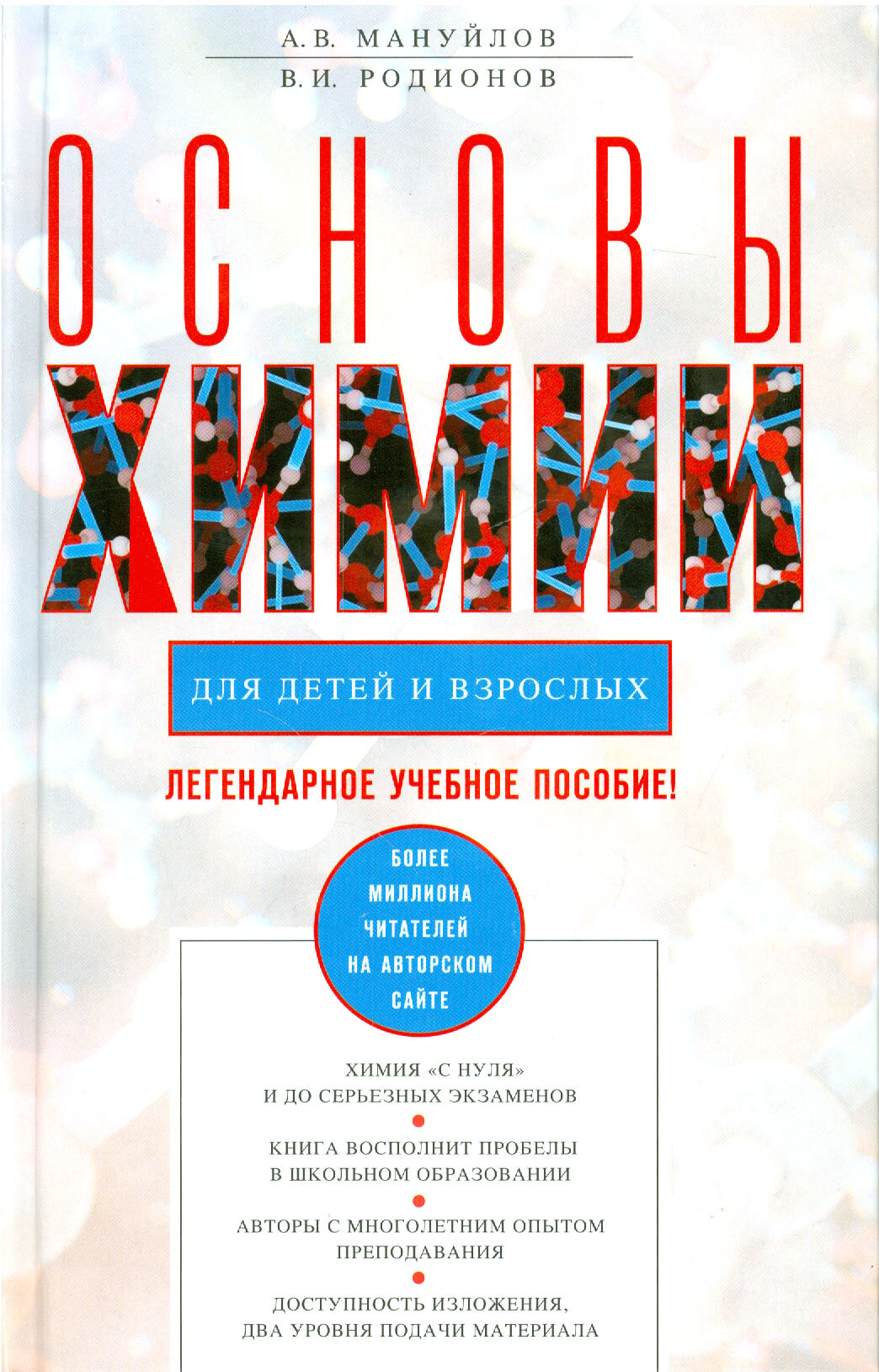 Перед вами долгожданная книга Александра Викторовича Мануйлова и Владимира Ивановича Родионова. Она уже получила широкую известность в России и за рубежом в виде интернет-учебника под названием "Основы химии". Среди ее читателей, число которых уже превысило миллион, неожиданно оказались не только школьники. Первоначально задуманная как учебник, книга после всех дополнений и изменений стала отвечать еще и жанру научно-популярной, познавательной литературы. Основы современной химии изложены здесь в самой доступной форме, что позволяет не только изучать химию "с нуля", но и подготовиться к серьезным экзаменам. Студентам она поможет восполнить пробелы в школьном образовании. Книга адресована самому широкому кругу читателей: подрастающему поколению и взрослым, не утратившим интерес к устройству окружающего мира. 3-е издание, доработанное.