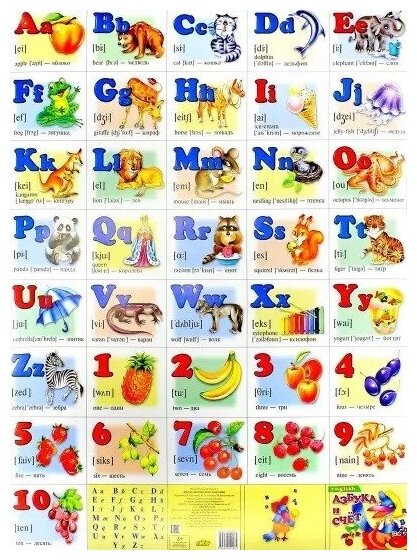 Наглядное пособие в виде иллюстрированного плаката с английским алфавитом и цифрами для дошкольников и младшего школьного возраста.