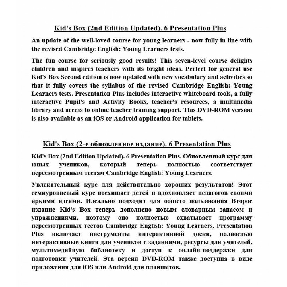 Kid's Box Updated edition Presentation Plus включает в себя интерактивные инструменты электронной доски, полностью интерактивные книги: учебник и рабочую тетрадь, ресурсы для учителя, мультимедийную библиотеку и доступ к онлайн-поддержке обучения учителей. Эта версия DVD-ROM также доступна в качестве приложения для iOS или Android для планшетов.