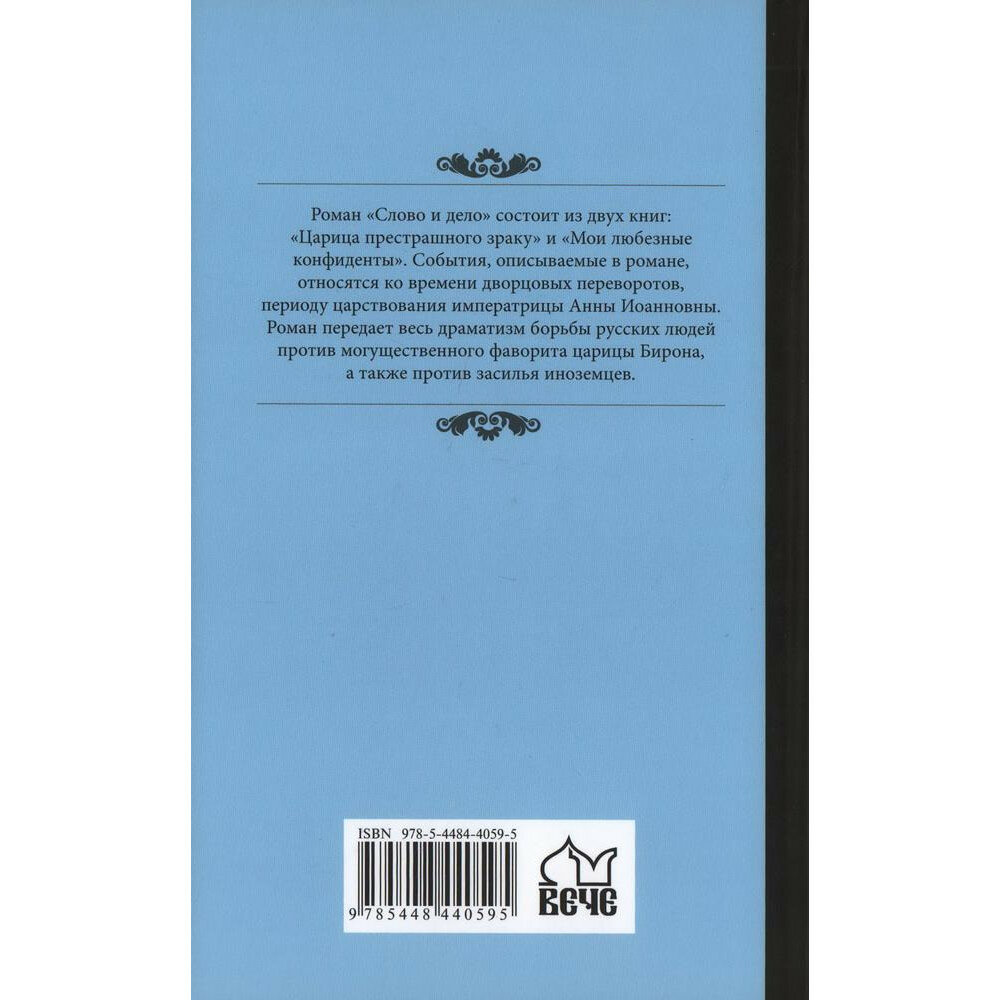 Роман "Слово и дело" состоит из двух книг: "Царица престрашного зраку" и "Мои "любезные" конфиденты". События, описываемые в романе, относятся ко времени дворцовых переворотов, периоду царствования императрицы Анны Иоанновны. Роман передает весь драматизм борьбы русских людей против могущественного фаворита царицы Бирона, а также против засилья иноземцев.