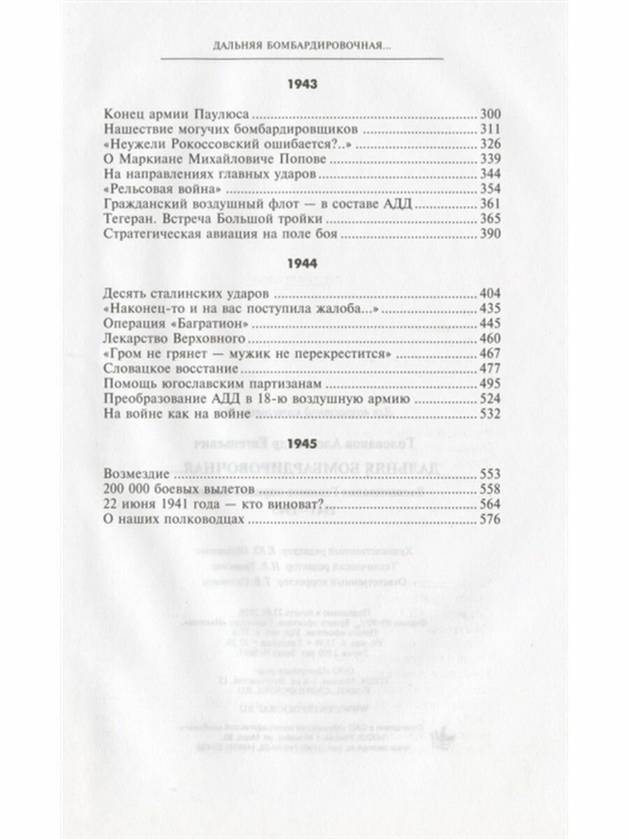 Необычайно яркий взлет в 1941 - 1945 годах и необычайно долгое и глухое замалчивание после войны - такова судьба автора мемуаров "Дальняя бомбардировочная." Главного маршала авиации А.Е. Голованова. Причина опалы заключалась в том, что его деятельность в годы войны была подчинена И.В. Сталину, о котором Голованов много пишет в своей книге. Увлекательно и живо рассказывает Главный маршал о самоотверженных полетах экипажей бомбардировщиков, о многих драматических эпизодах на фронтах и в Ставке, участником и свидетелем которых был. Книга А.Е. Голованова, несомненно, входит в золотой фонд российской военной мемуаристики.