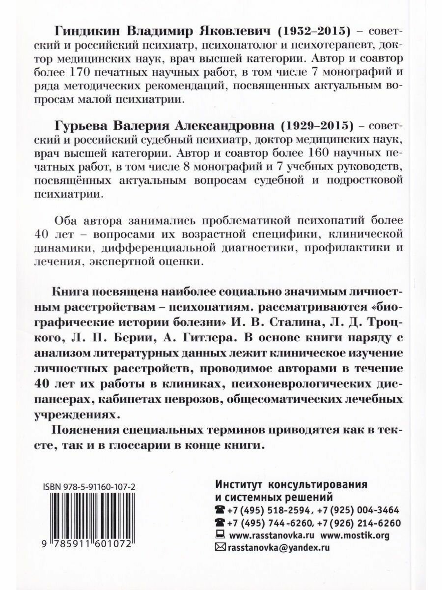 Книга посвящена наиболее социально значимым личностным расстройствам - психопатиям, рассматриваются "биографические истории болезни" И. В. Сталина, Л. Д. Троцкого, Л. П. Берии, А. Гитлера. В основе книги наряду с анализом литературных данных лежит клини-ческое изучение личностных расстройств, проводимое авторами в течение 40 лет их работы в клиниках, психоневрологических диспансерах...