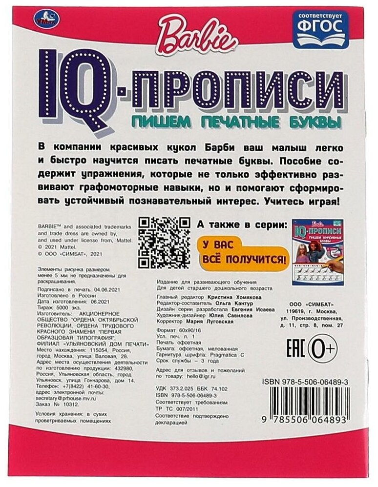Книга IQ-прописи Пишем печатные буквы. Барби Умка 978-5-506-06489-3 (Кантур Ольга), 2021