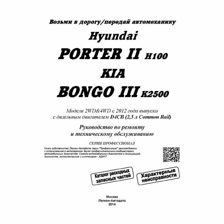Руководство по ремонту Hyundai PORTER II & KIA BONGO III с 2012 года выпуска 2WD&4WD с дизельным двигателем D4CB (2,5л Common Rail). Издание содержит руководство по эксплуатации, подробные сведения по техническому обслуживанию автомобиля, диагностике, ремонту и регулировке элементов систем двигателя (в т.ч. топливной системы Common Rail, системы смазки, охлаждения, турбонаддува, запуска и зарядки), элементов механической 6-ти ступенчатой коробки передач (M6AR1), раздаточной коробки (в т.ч. системы управления полным приводом), заднего и переднего редукторов, тормозной системы (в т.ч. элементов антиблокировочной системы тормозов (ABS)), рулевого управления и подвески, кузовных элементов, системы кондиционирования и вентиляции. Приведены инструкции по диагностике 3 электронных систем: управления дизельным двигателем Common Rail, ABS, иммобилайзером. Подробно описаны 136 кодов неисправностей Р0, Р1, Р2, С1, С2, U0, U1, условия их возникновения и возможные причины. Приведены разъемы и процедуры проверки сигналов на выводах блоков управления - PinData. Представлены 105 подробных электросхем (17 систем) для моделей Hyundai PORTER II и KIA BONGO III, описание большинства элементов электрооборудования и фотографии мест расположения разъемов на автомобиле. Приведены возможные неисправности и методы их устранения, сопрягаемые размеры основных деталей и пределы их допустимого износа, рекомендуемые смазочные материалы, рабочие жидкости и каталожные номера запчастей, необходимых для технического обслуживания, размеры рекомендуемых шин и дисков. Книга будет полезна как автовладельцам, начинающим и опытным, так и профессионалам авторемонта и диагностики. Автовладелец найдет для себя полезными: инструкцию по эксплуатации, техническое обслуживание (с периодичностью и необходимыми материалами), наиболее характерные для данного автомобиля неисправности, каталог наиболее востребованных запасных частей, инструкции по самостоятельному ремонту. Профессионалам будут полезны: операции по сложному ремонту, данные по диагностике и подробные схемы электрооборудования. Книги серии "Профессионал" могут выручить Вас в дороге, если Вам придется пользоваться услугами автосервиса, незнакомого или малознакомого с особенностями модели Вашего автомобиля. Отдавая автомобиль на СТО, оставьте нашу книгу в автомобиле, и, в случае каких-либо затруднений, автомеханик сможет воспользоваться ею, что значительно ускорит ремонт Вашего автомобиля. Качественное изложение материала позволяет сократить время обслуживания автомобиля и сделать его более эффективным. Книга предназначена для автовладельцев, персонала СТО и ремонтных мастерских. Книги издательства "Легион-Автодата" серии "Профессионал" рекомендованы к использованию в автосервисах двумя профессиональными сообществами автомобильных диагностов: Союзом автомобильных диагностов и Ассоциацией диагностов, автоэлектриков и чиптюнеров - АДАКТ.