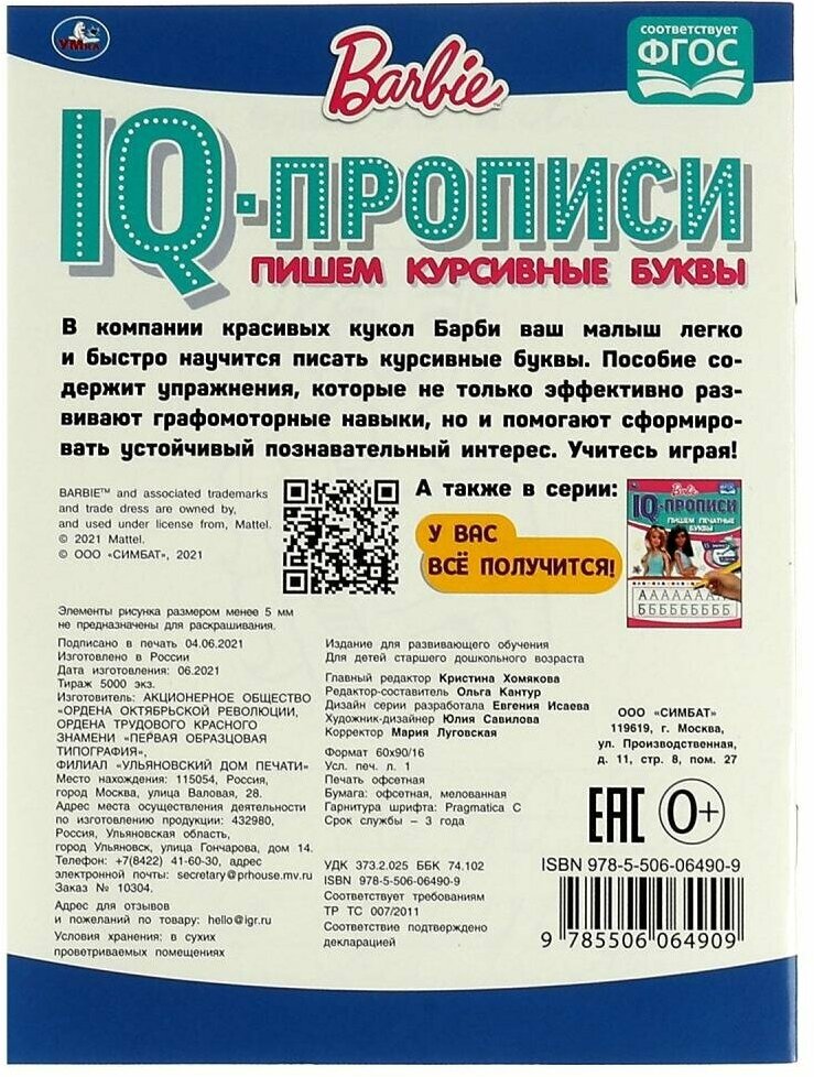 Книга Пишем курсивные буквы. IQ-прописи. Барби. 145Х195 мм. 16стр. 1+1. Умка в кор.50шт (без автора), 2021